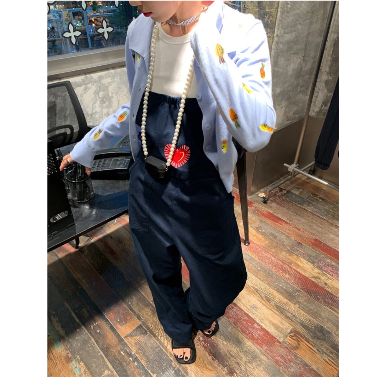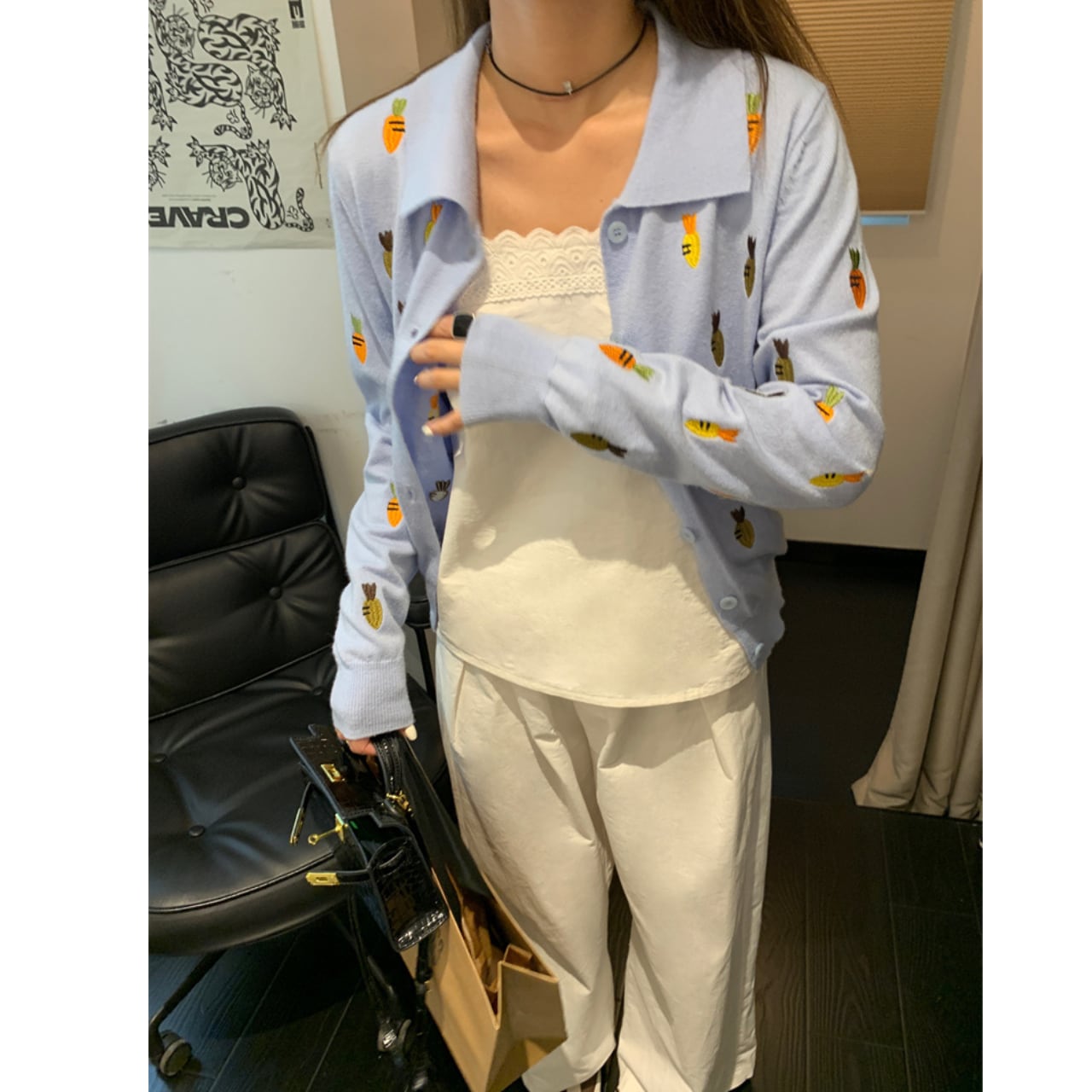 可愛いニンジン刺繍がポイントのニットカーディガン。