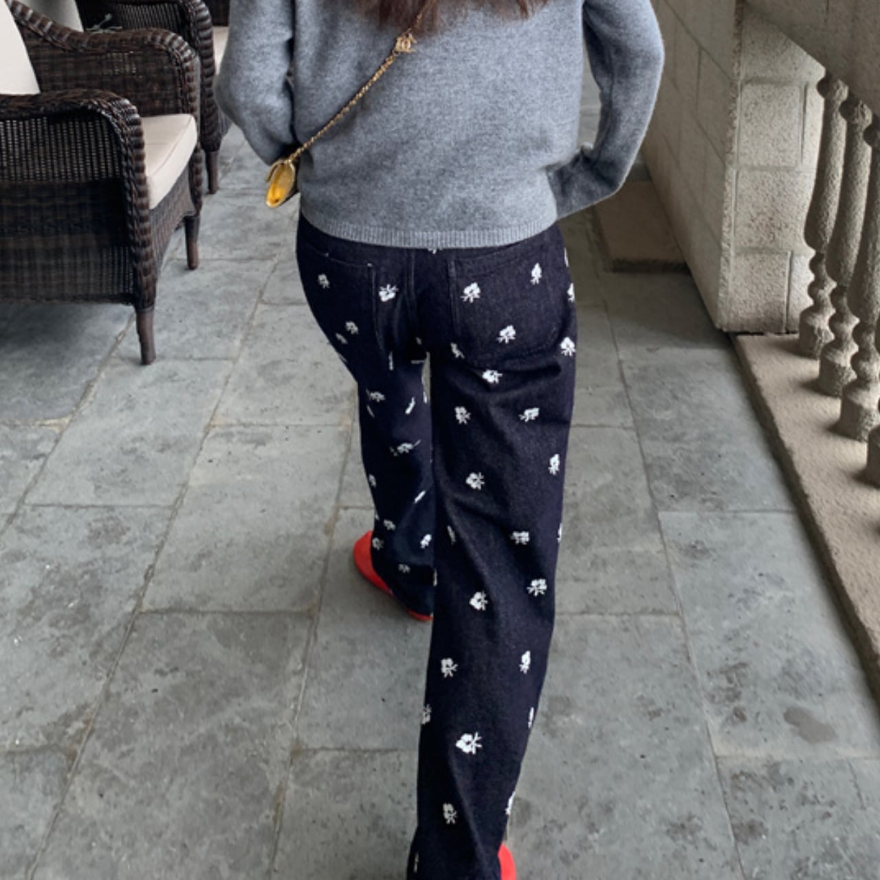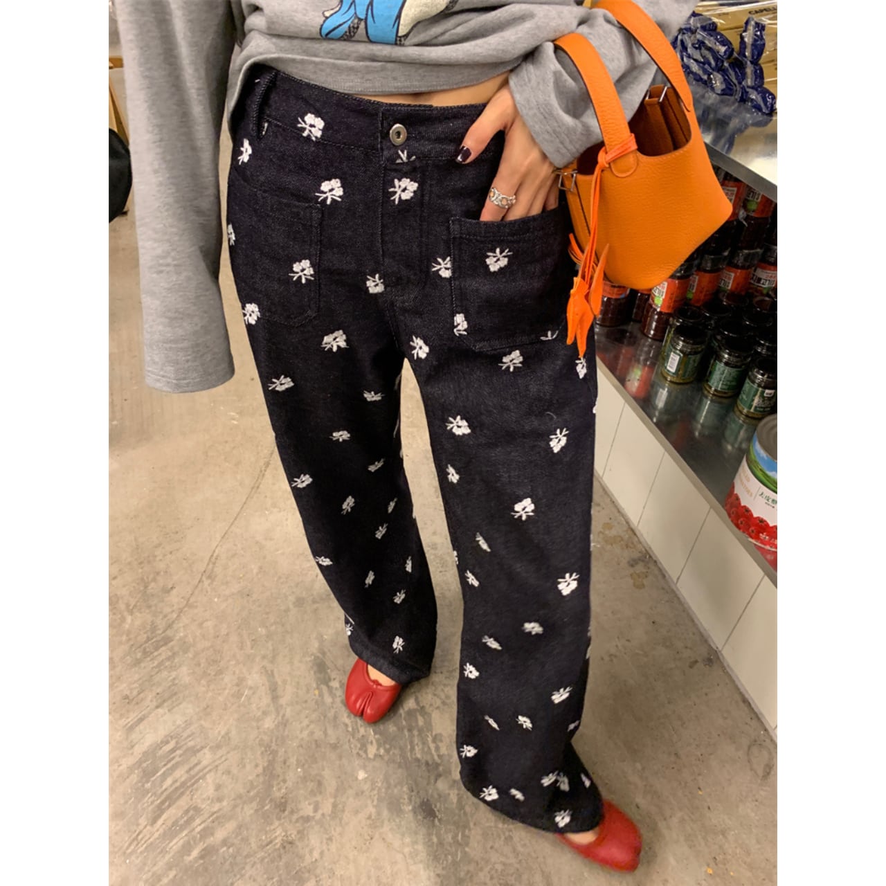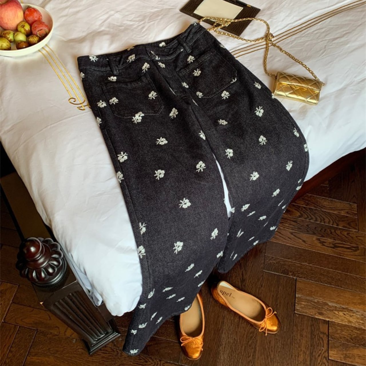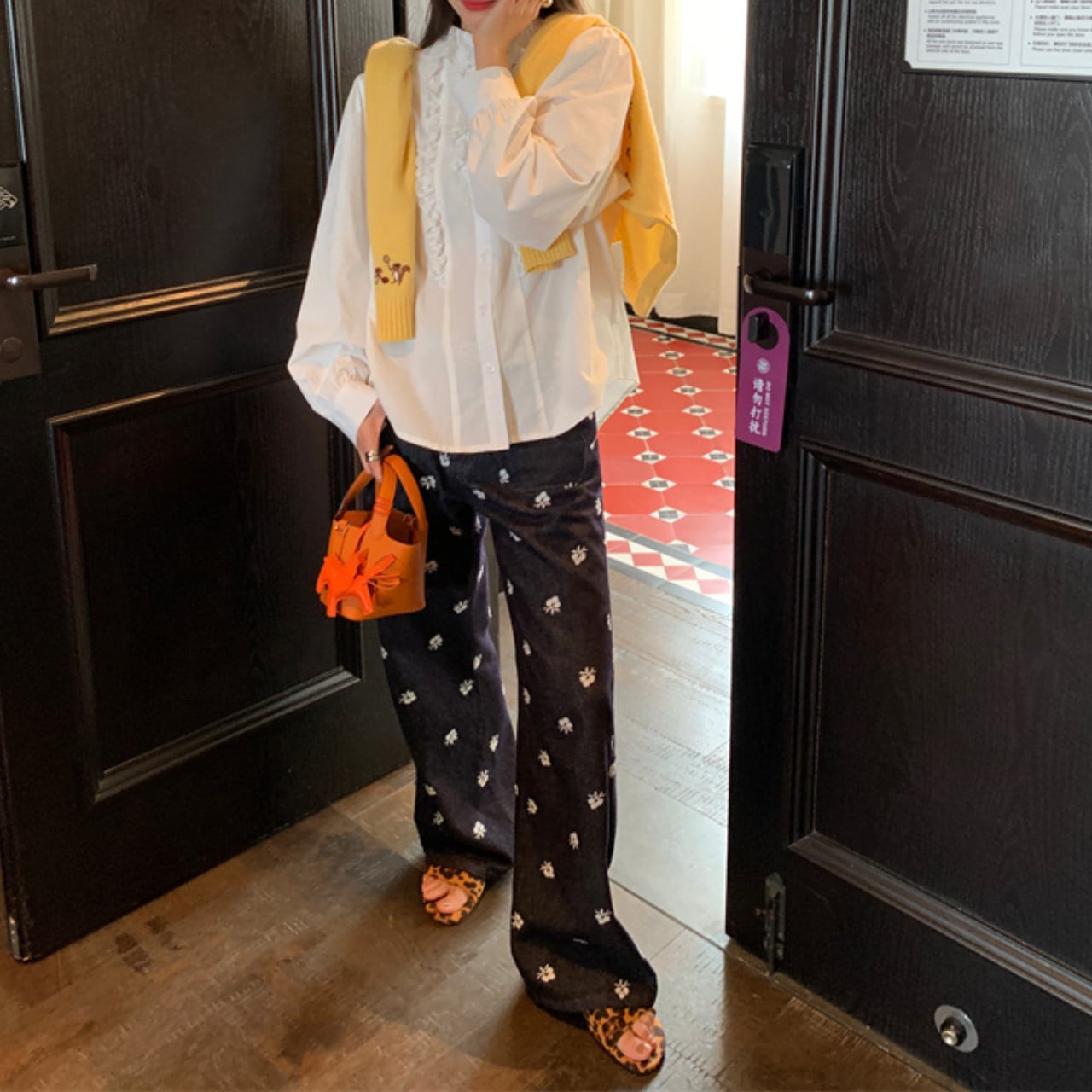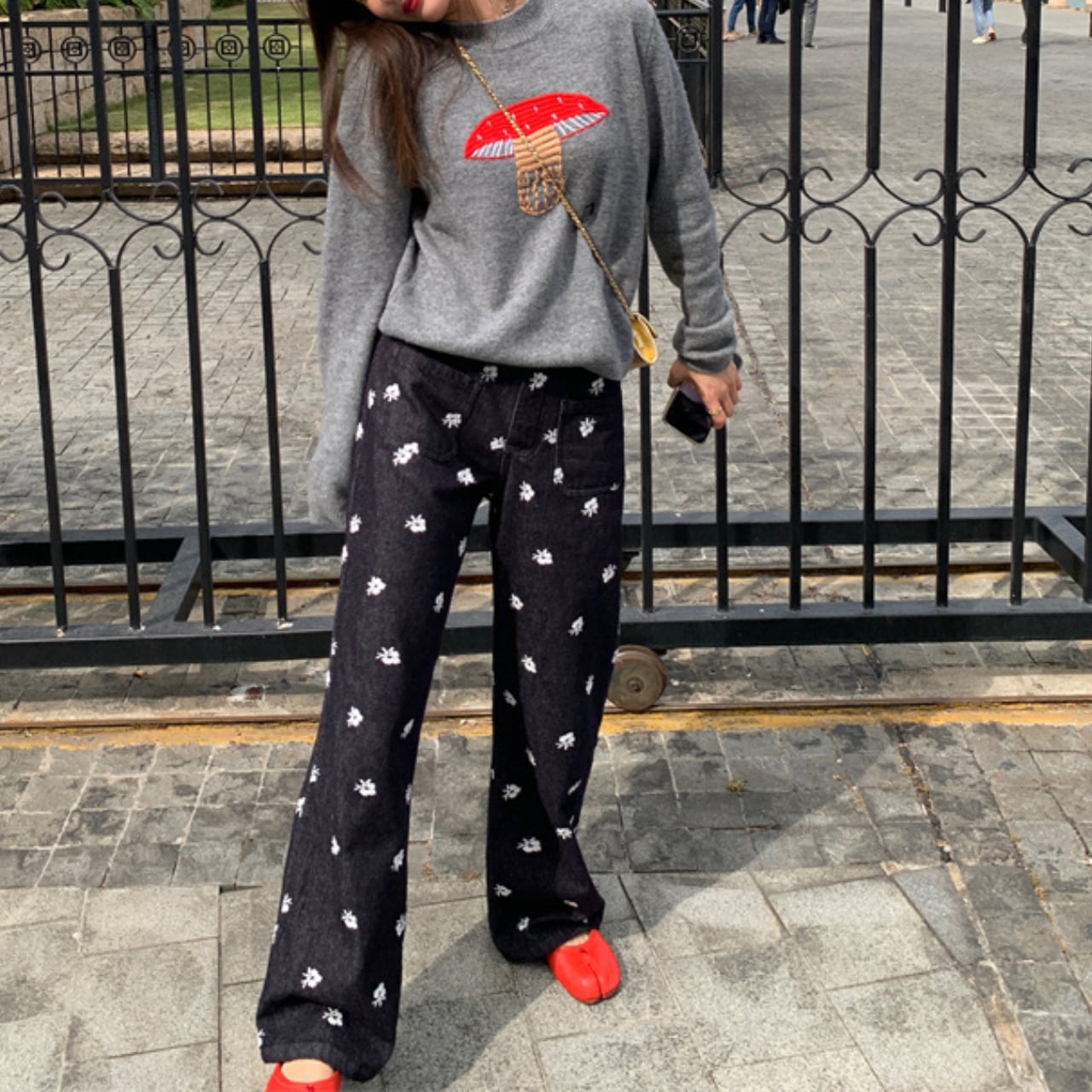小花刺繍を全体に散りばめた、カジュアルながらも女性らしさが光るデニムパンツ。