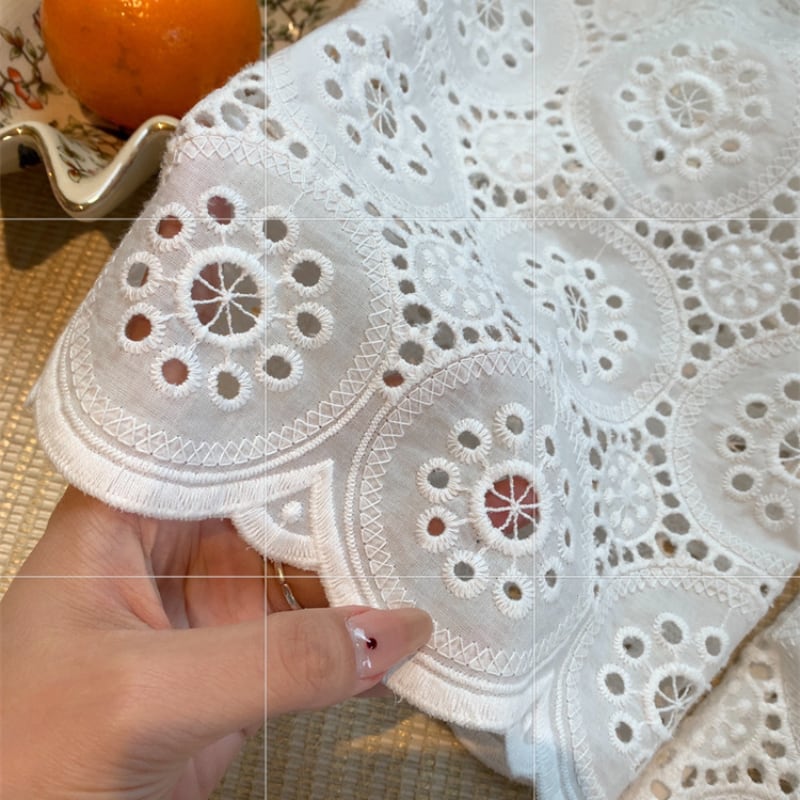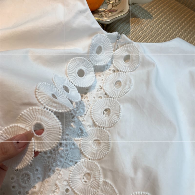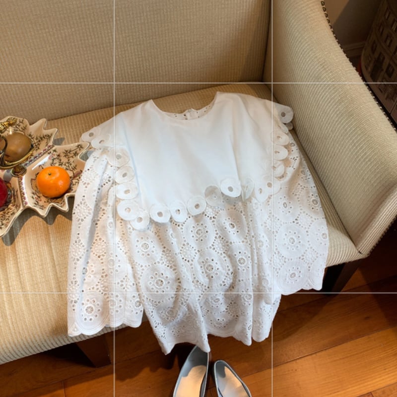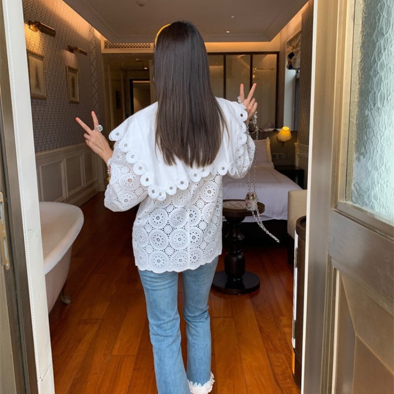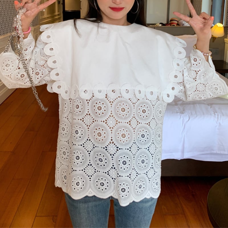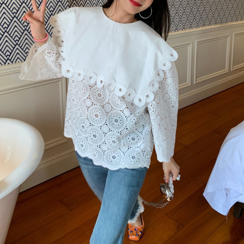大きめの襟とアイレット刺繍が目を惹く、ラウンドネックのロングスリーブブラウス。