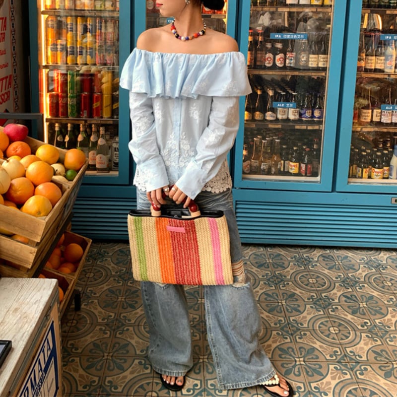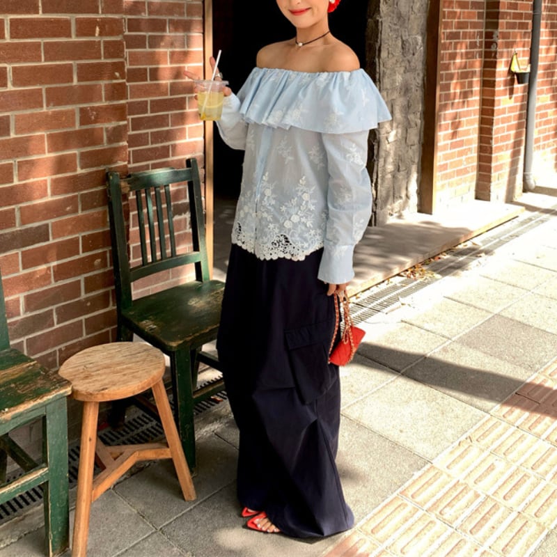 オフショルダー×ロングスリーブが絶妙なバランスのトップス。