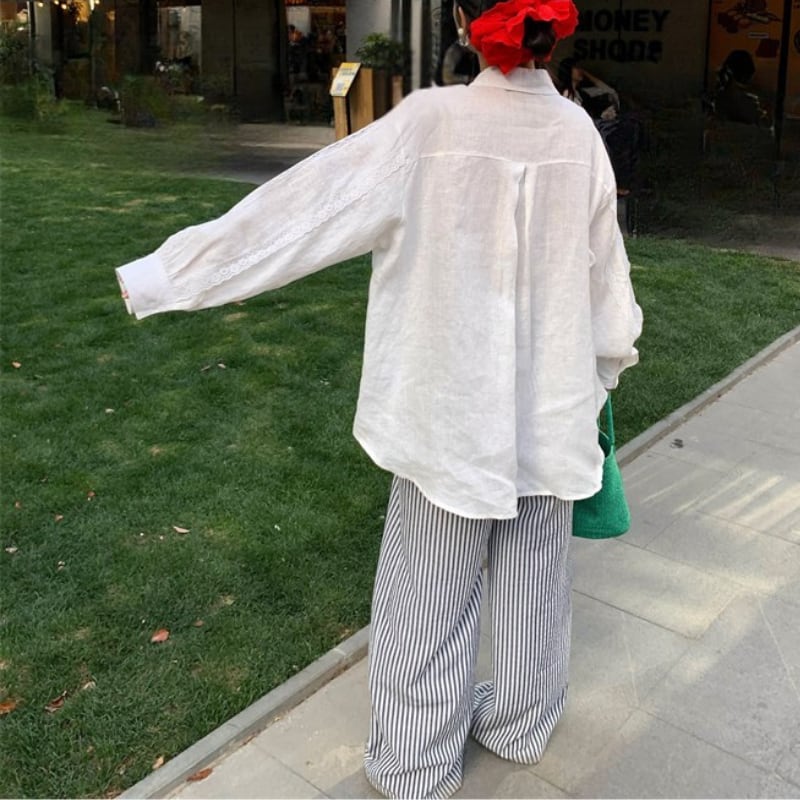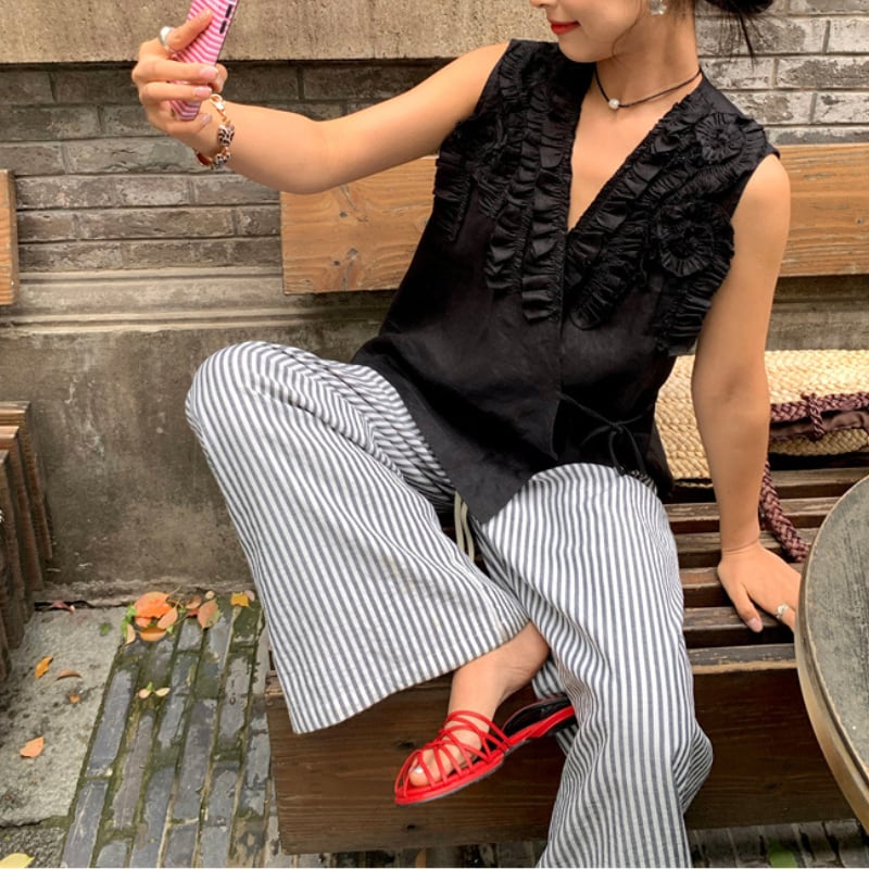 爽やかなストライプ柄が目を引くワイドシルエットのパンツ。
