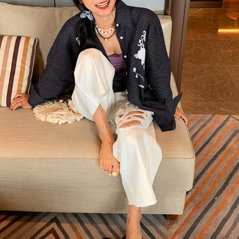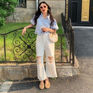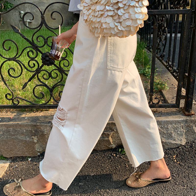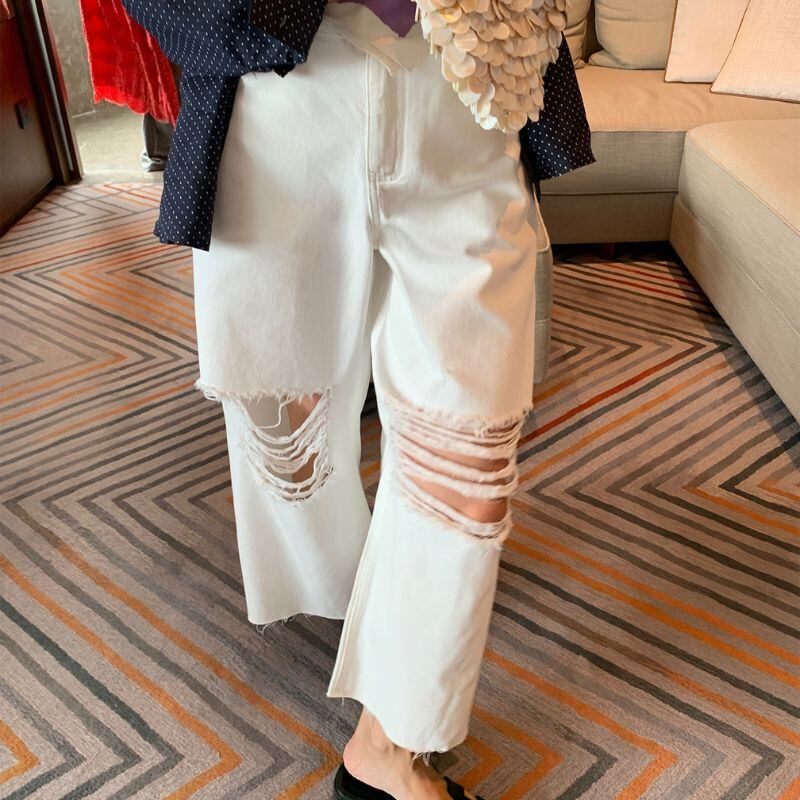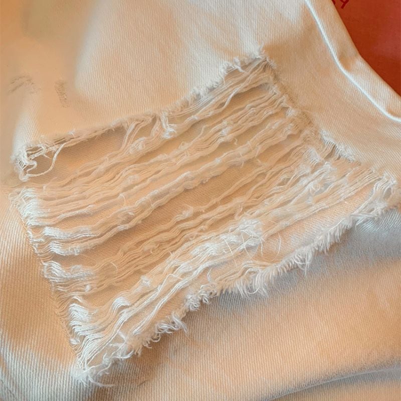 大胆なダメージ加工が印象的なホワイトデニムパンツ。