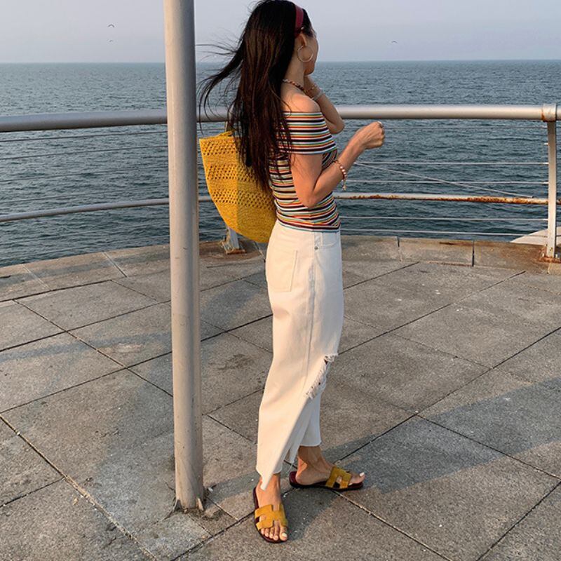 クロップド丈とハイウエストで脚長&抜け感を演出。