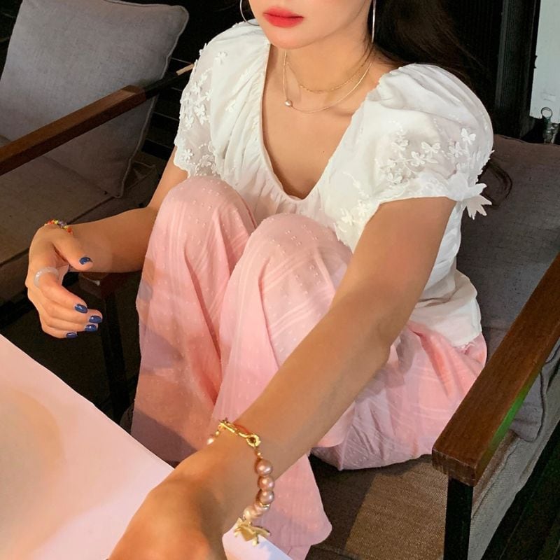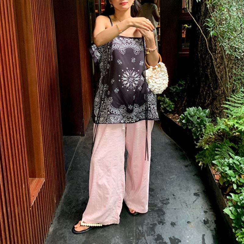 ウエストにあしらったレースが華やかな印象のワイドパンツ。