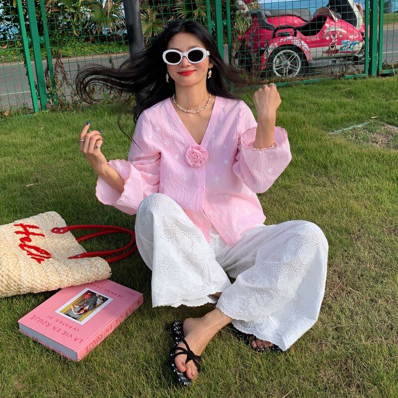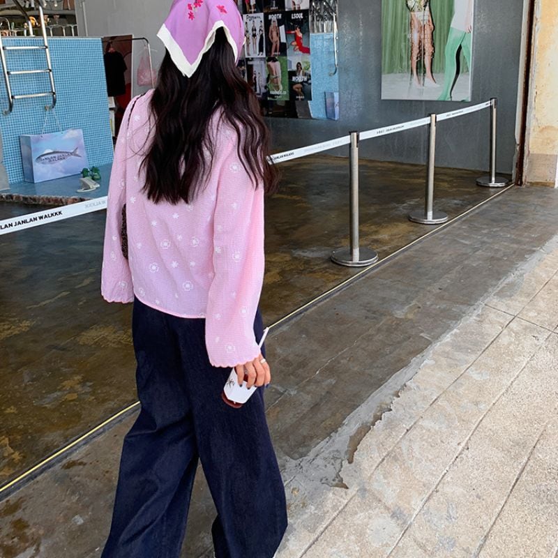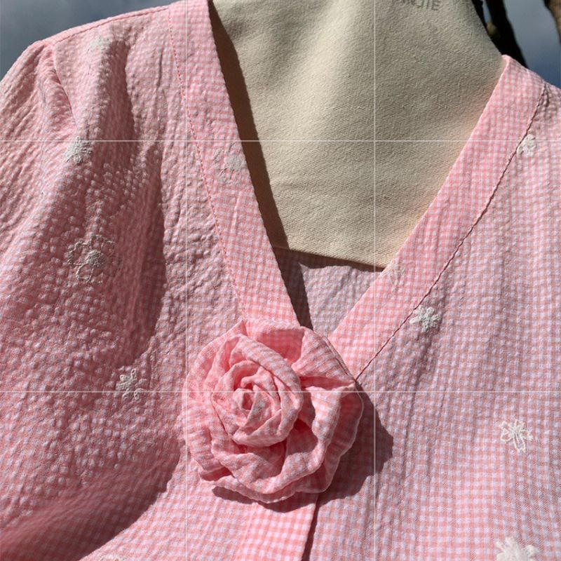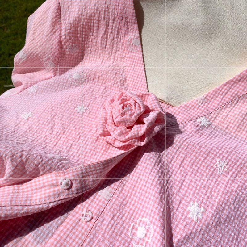 ギンガムチェック柄に小花の刺繍をあしらったフェミニンな一枚。