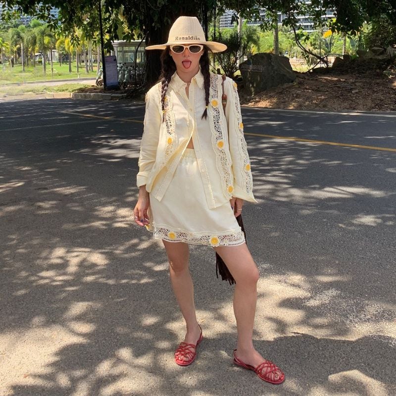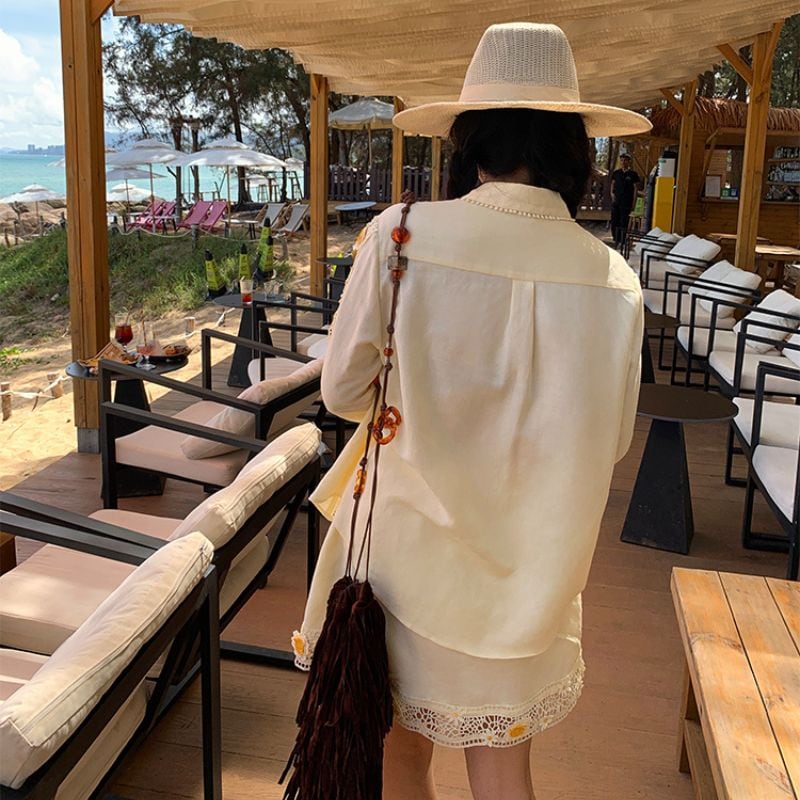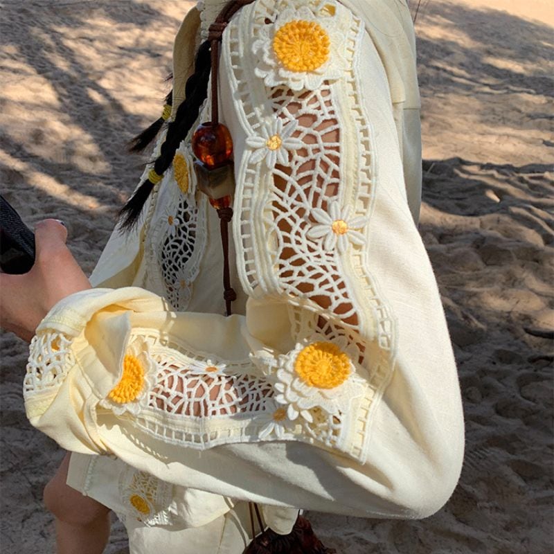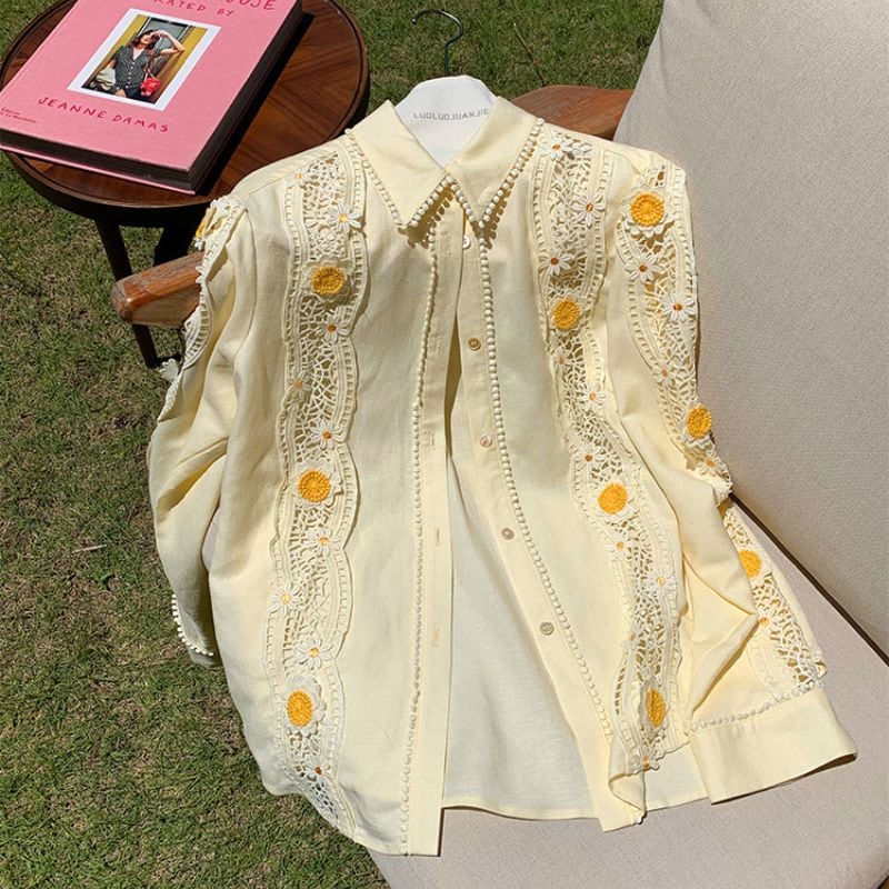 花モチーフが施された、華やかなクロシェ風シャツ。