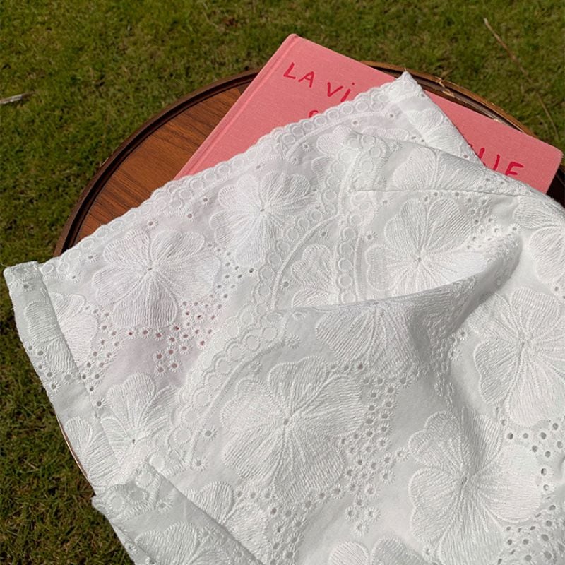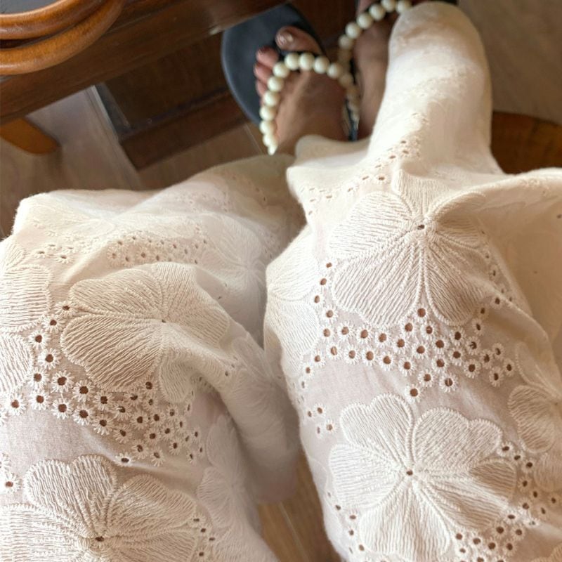 花柄のアイレット刺繍が目を引くワイドパンツ。