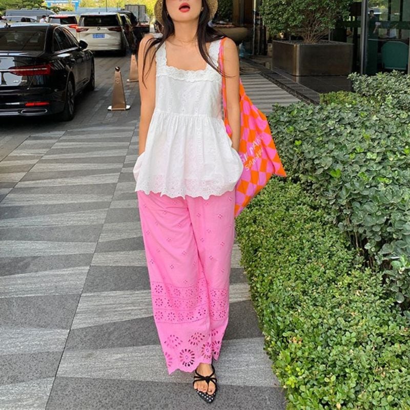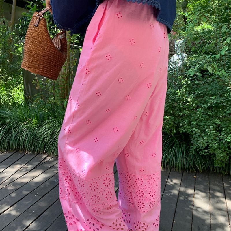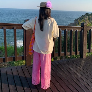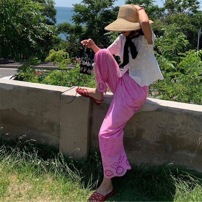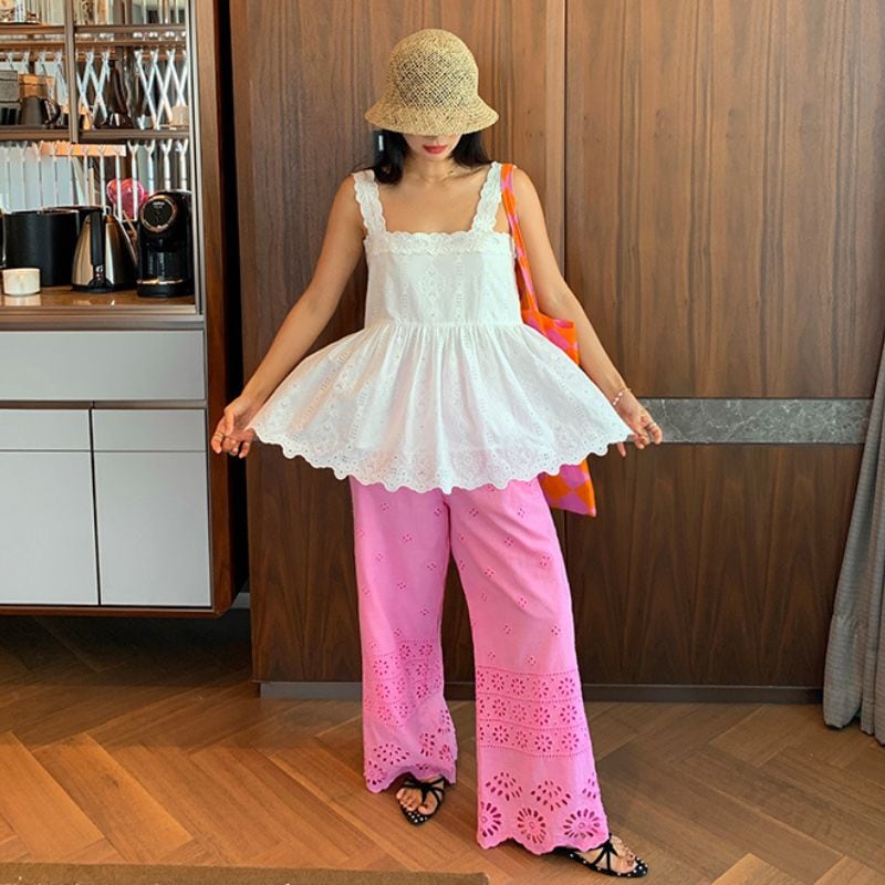 アイレット刺繍とスカラップヘムが可愛いワイドレッグパンツ。