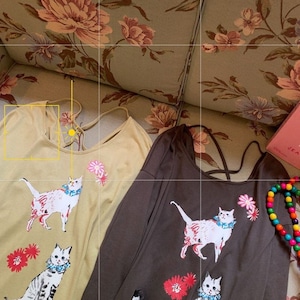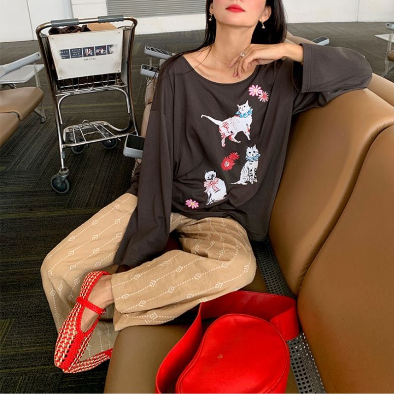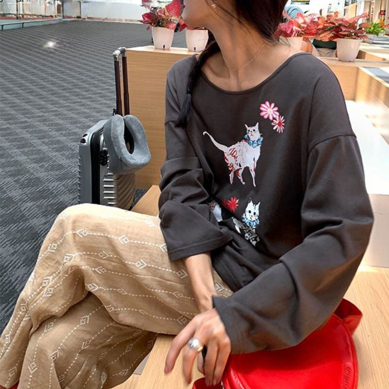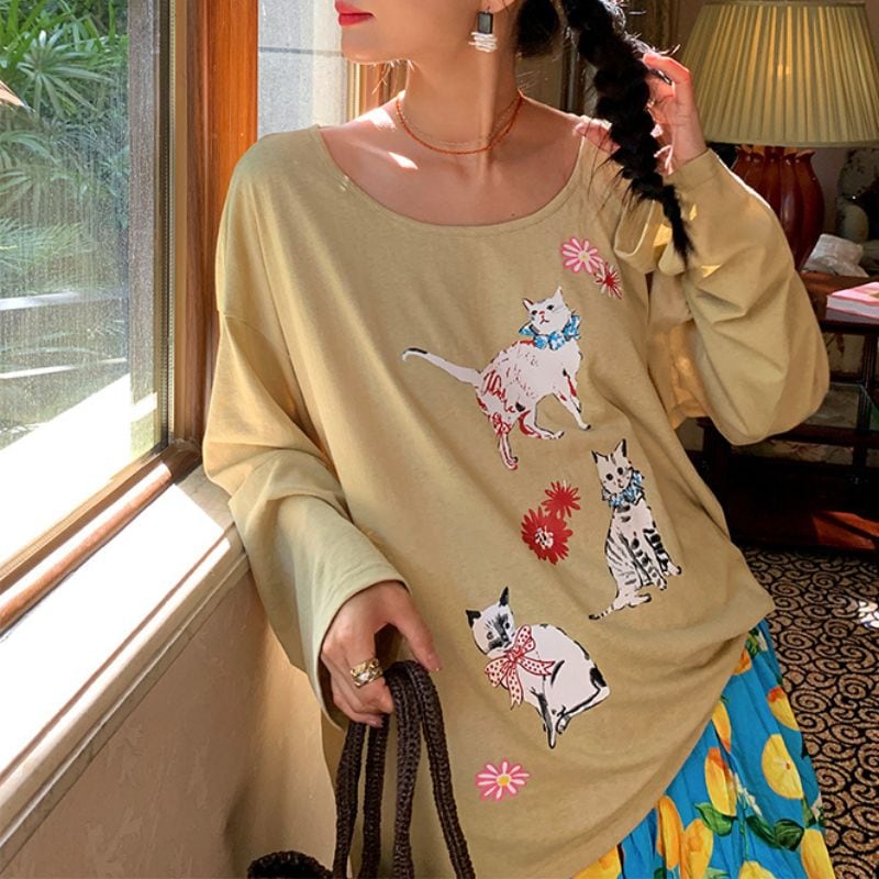 可愛らしい猫と花柄のプリントが目を引くトップス。