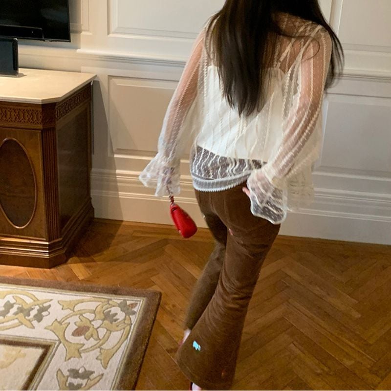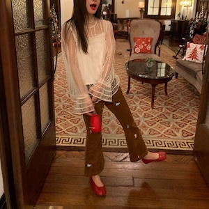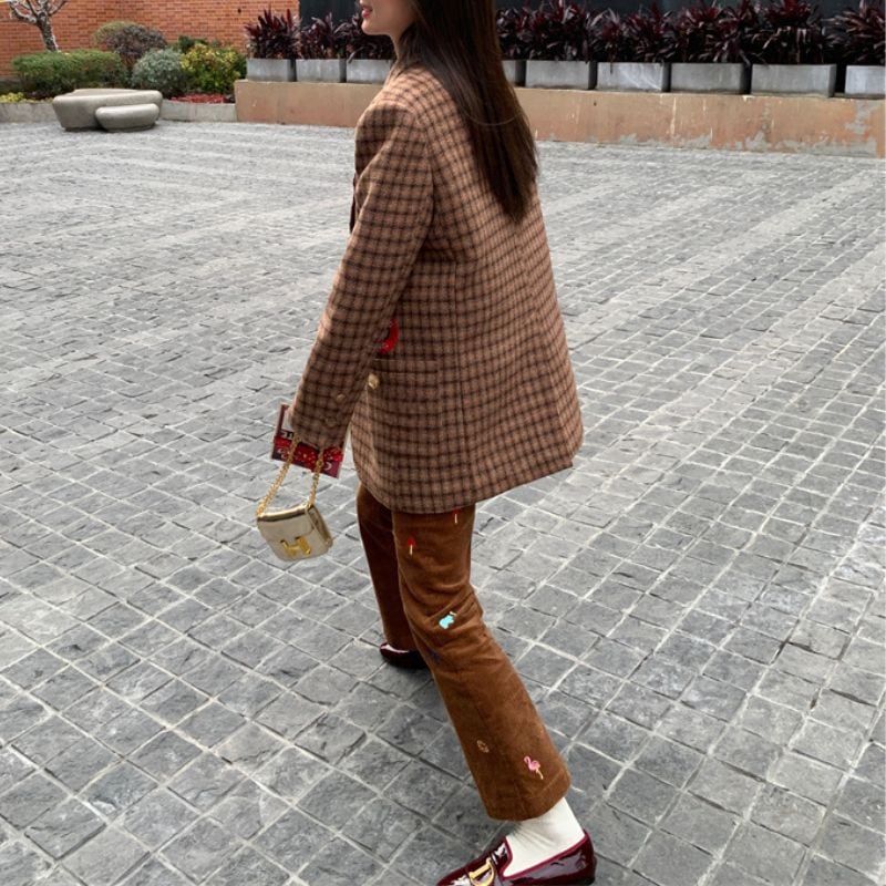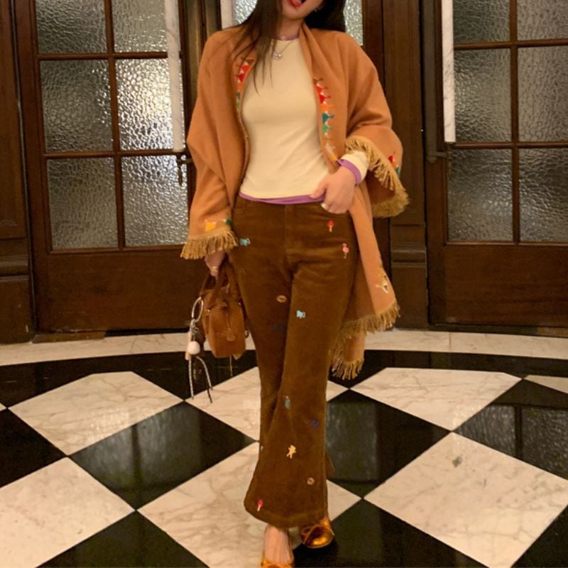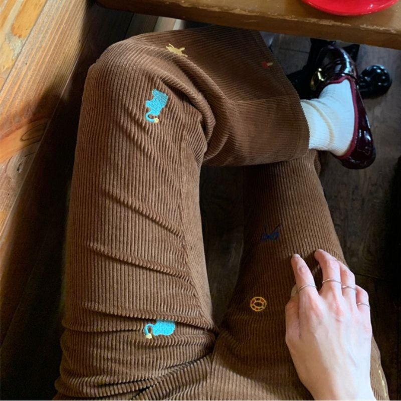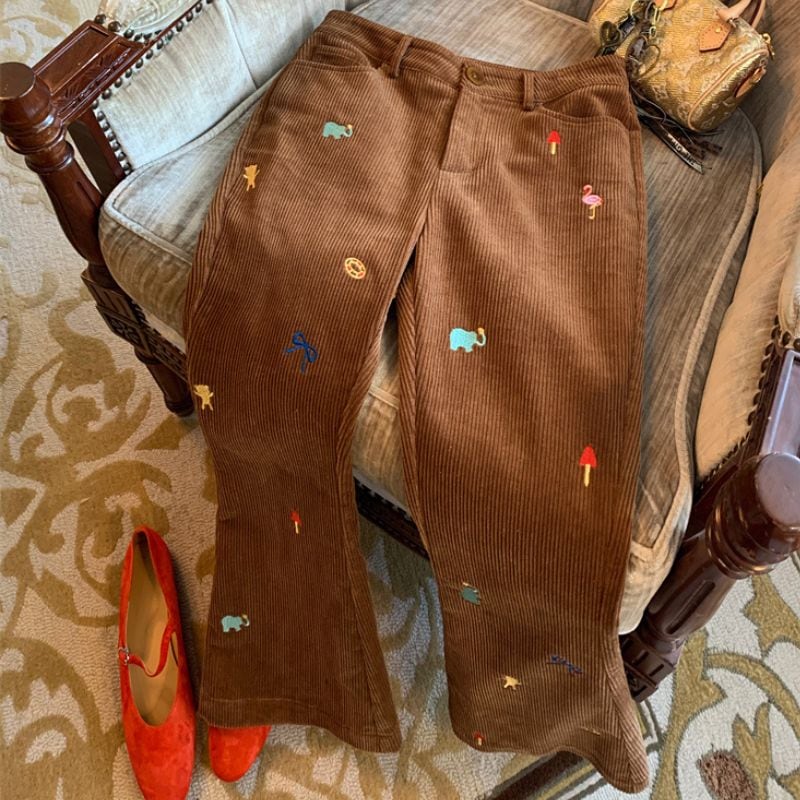 落ち着いた色味に遊び心のある刺繍が映えるフレアパンツ。