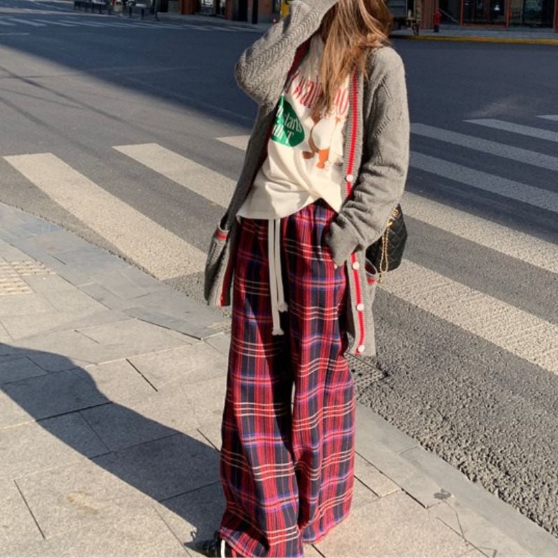 Checkered drawstring straight pants 00503