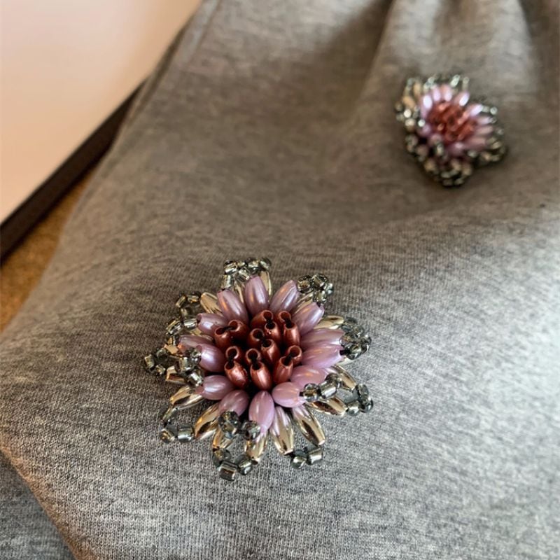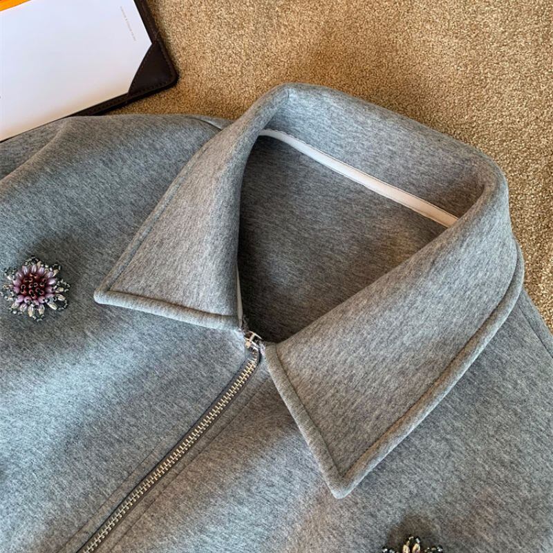 フラワーモチーフのビジューが映えるジップアップジャケット。