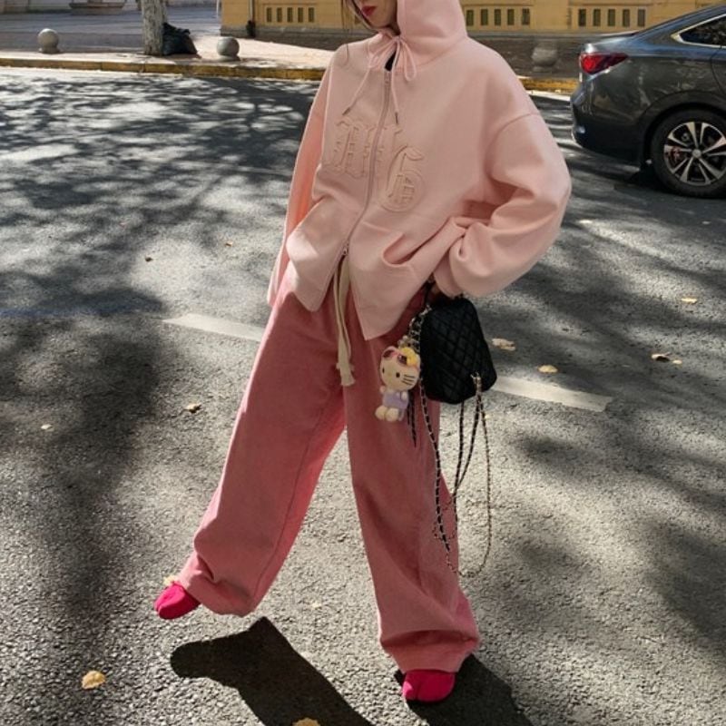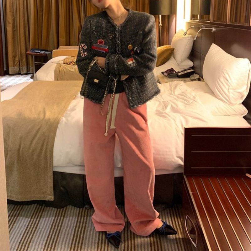 トレンド感あふれるピンクカラーが映えるワイドパンツ。