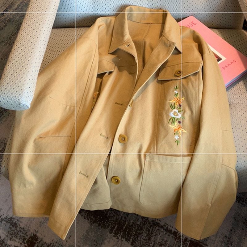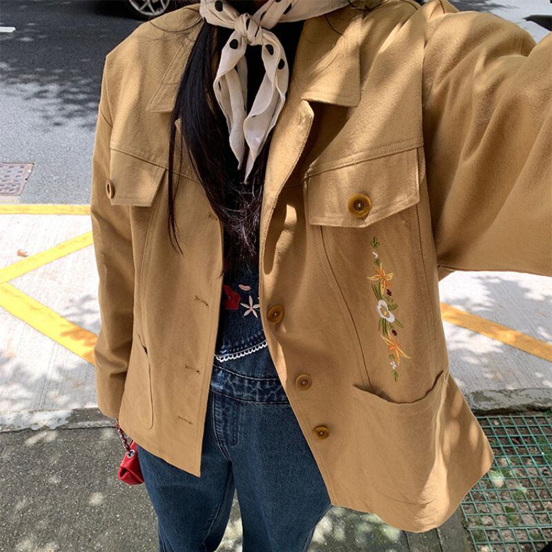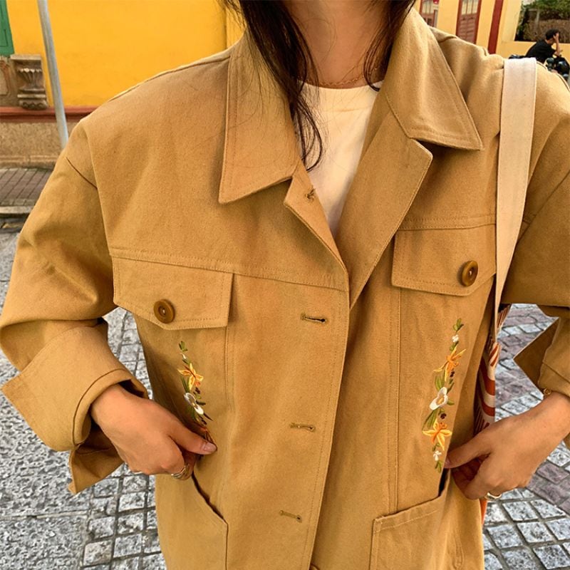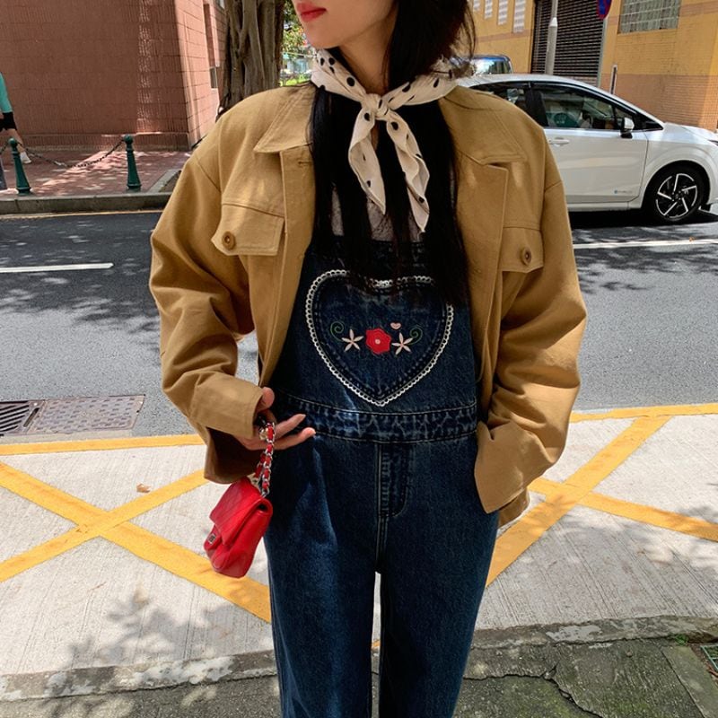 胸元に施された花刺繍が表情豊かなカバーオール。