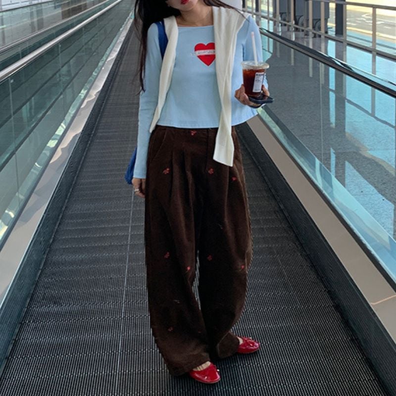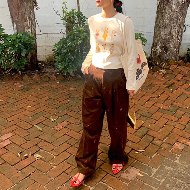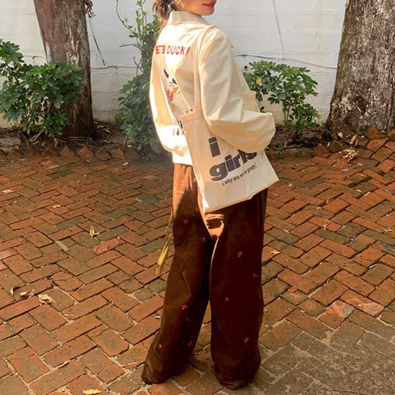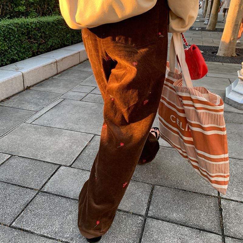 小花の刺繍が映えるコーデュロイワイドパンツ。