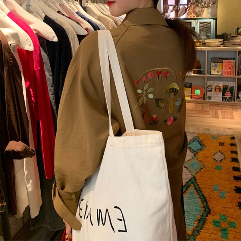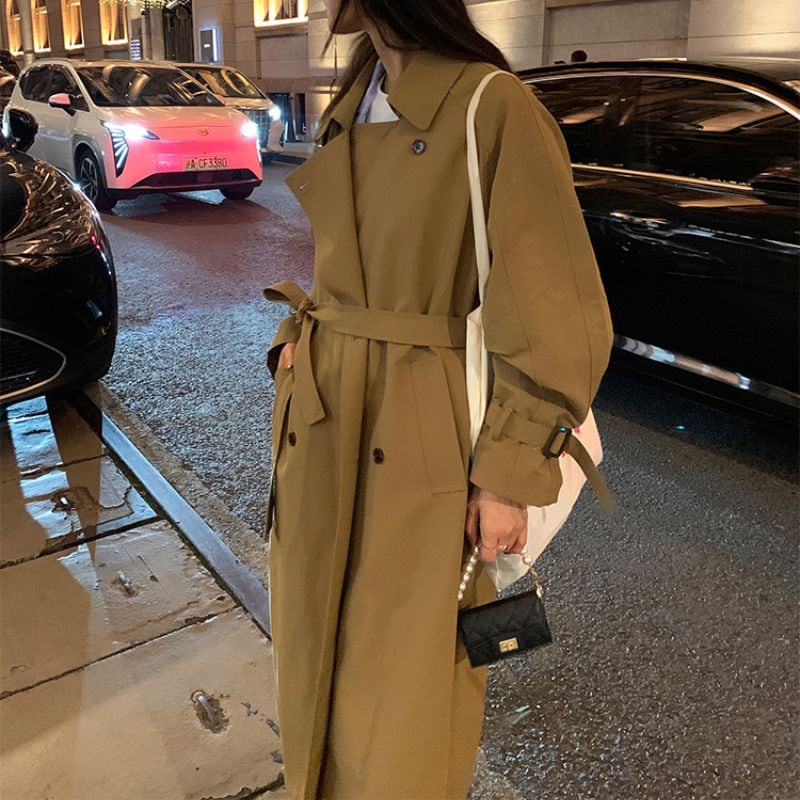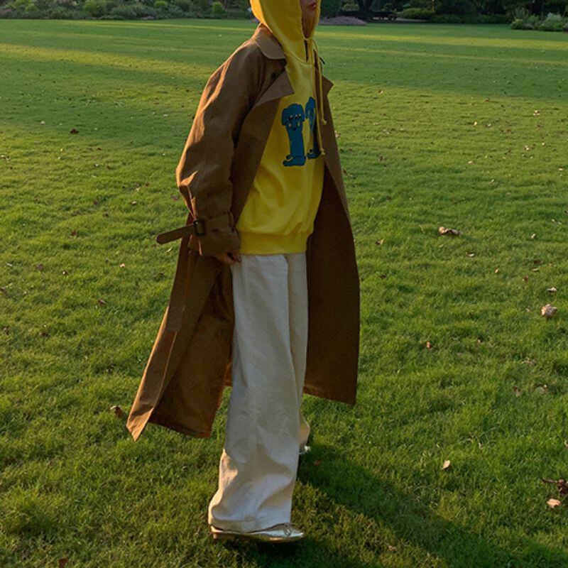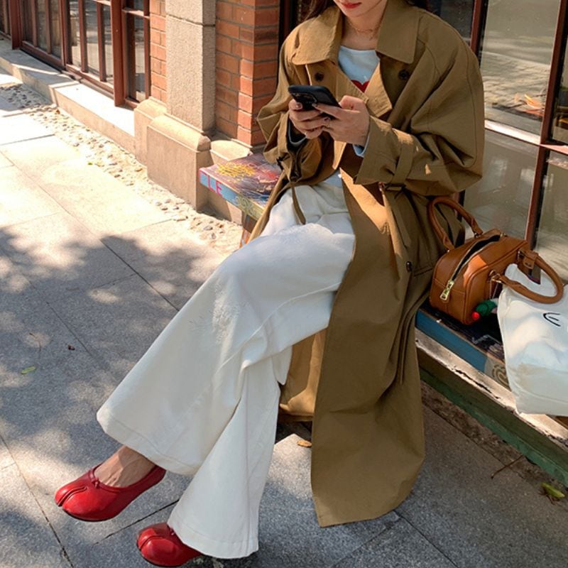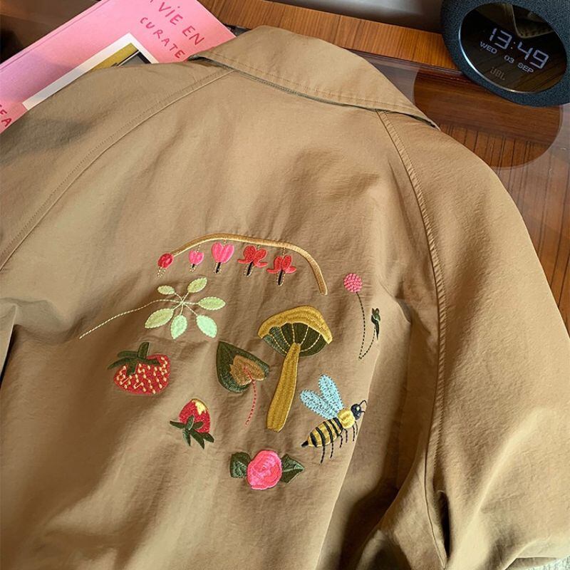 バックスタイルの刺繍が目を引くロングトレンチコート。