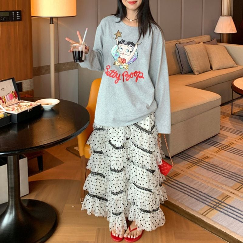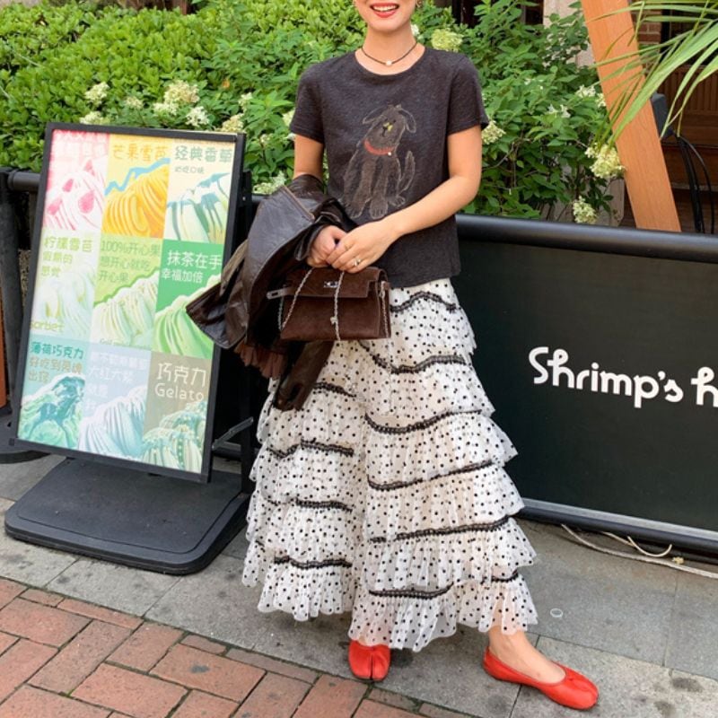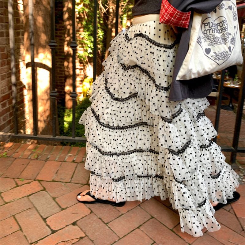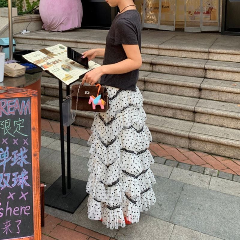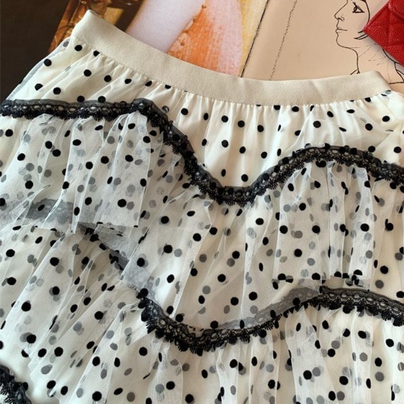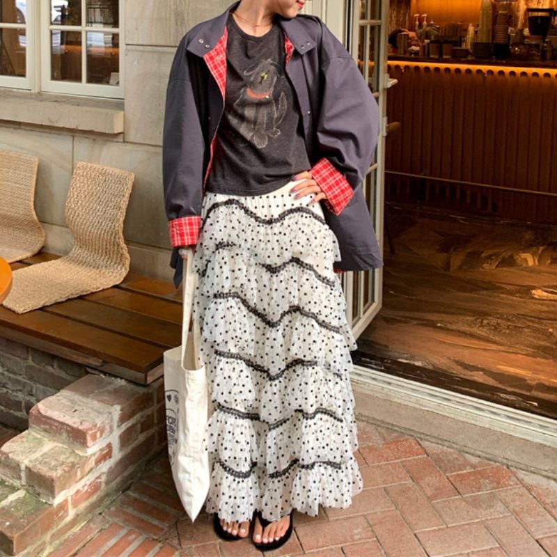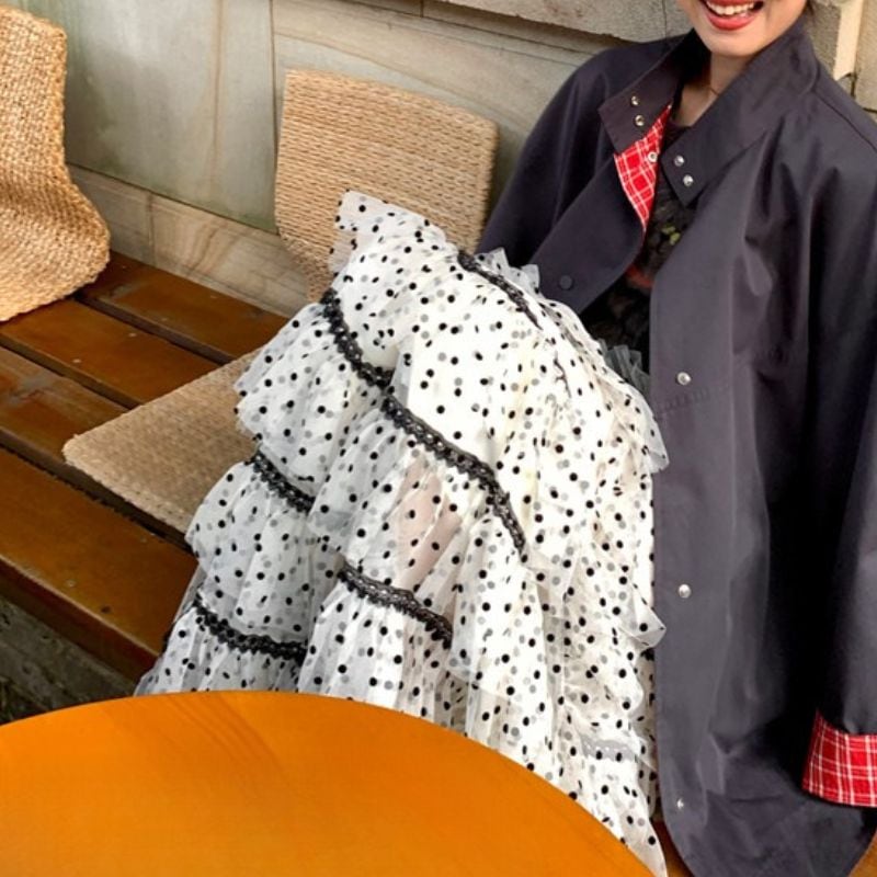 ドット柄とフリルの組み合わせがフェミニンな印象に◎