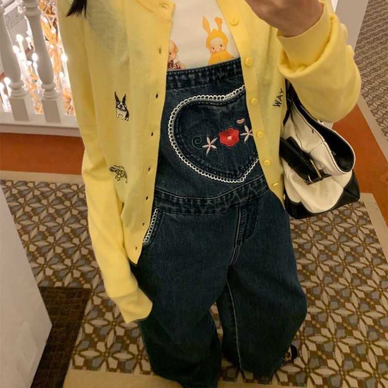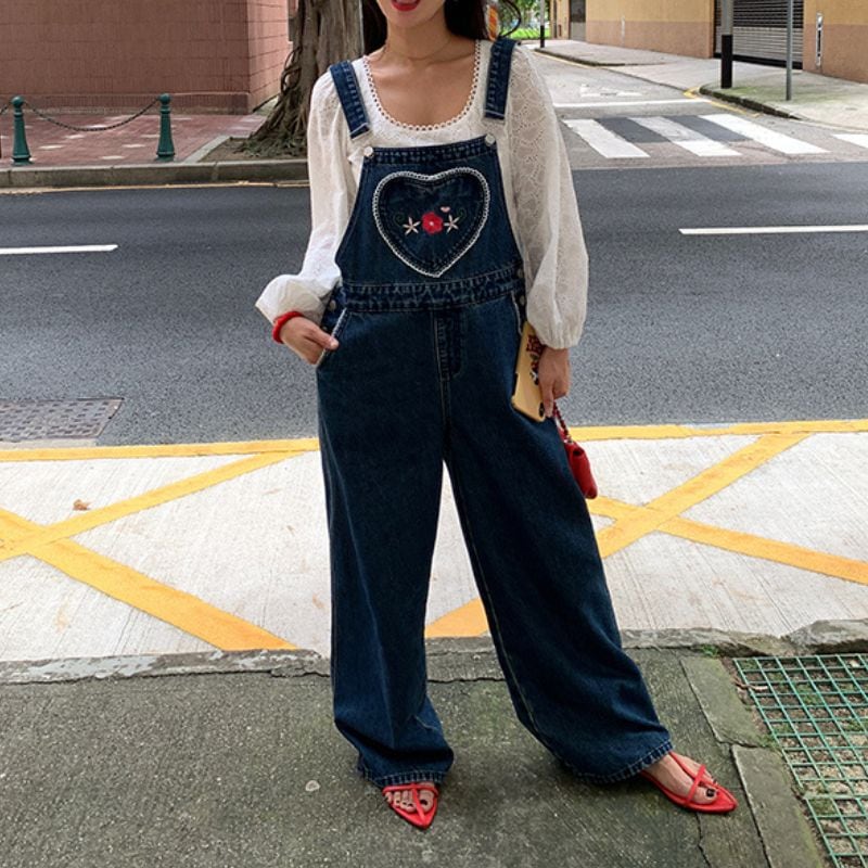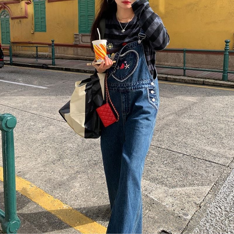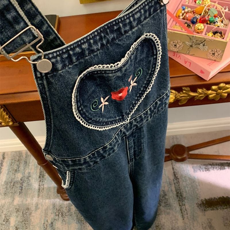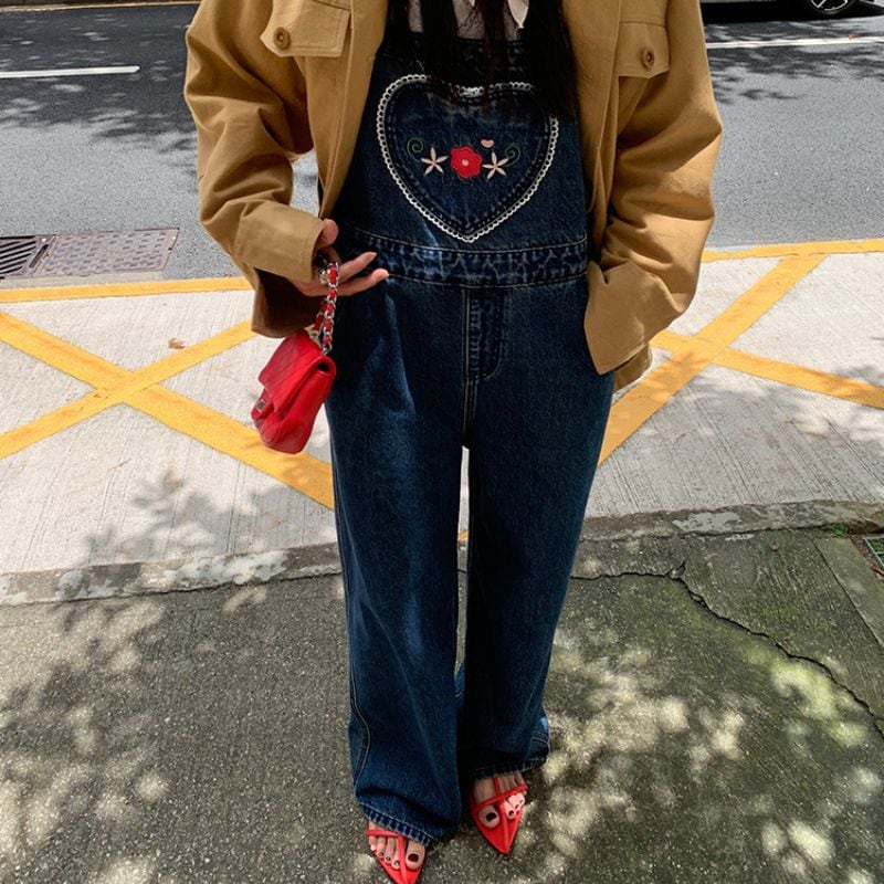 愛らしいハート刺繍が映えるデニムオーバーオール。