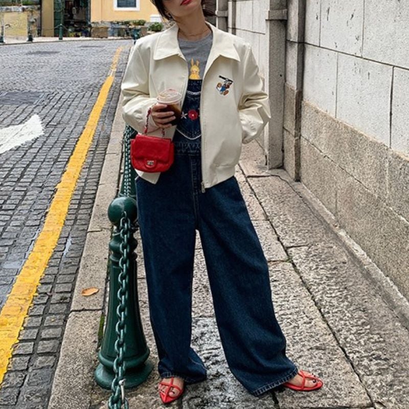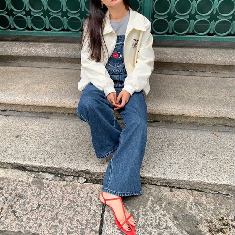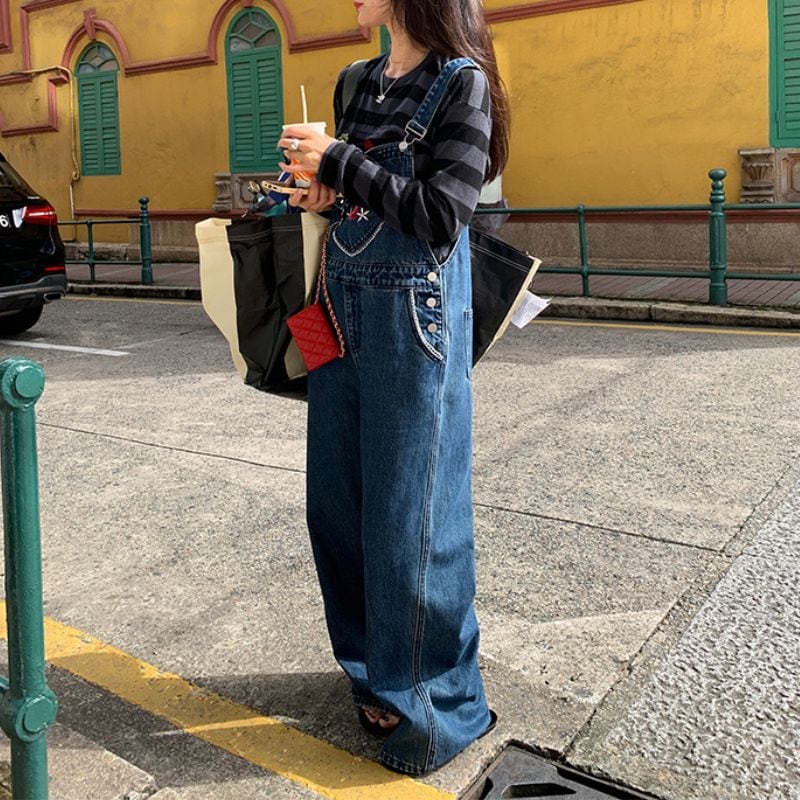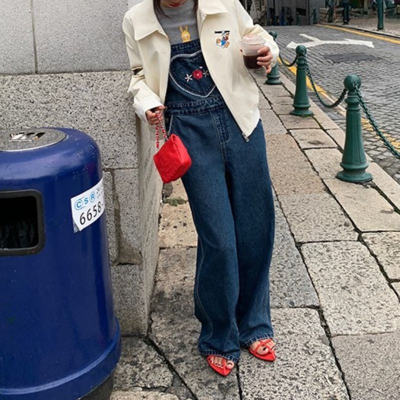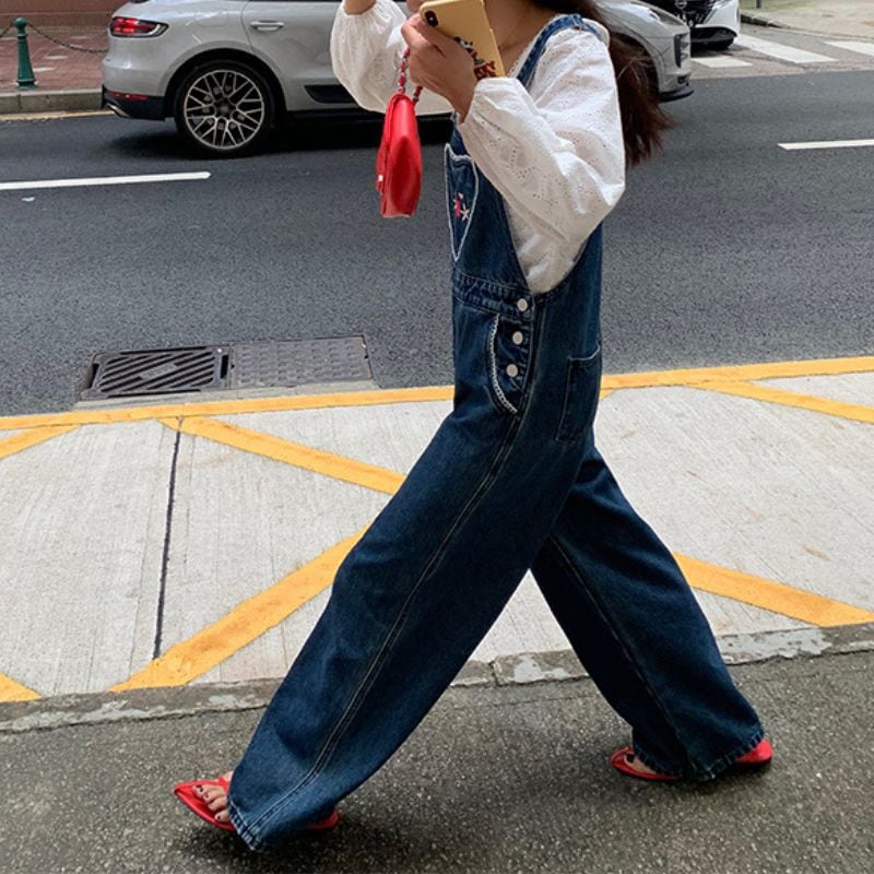 愛らしいハート刺繍が映えるデニムオーバーオール。