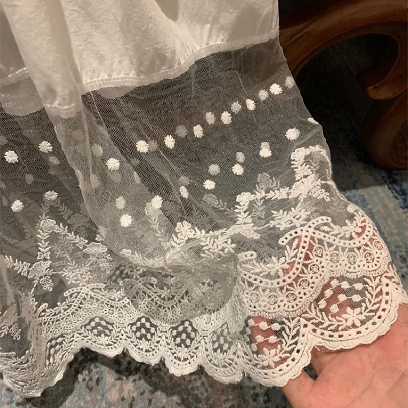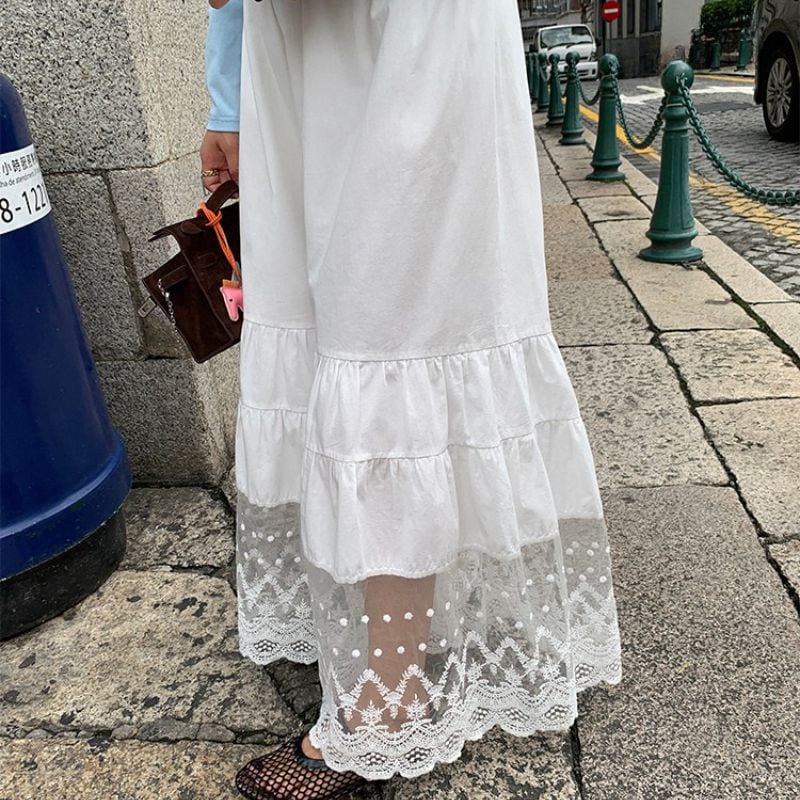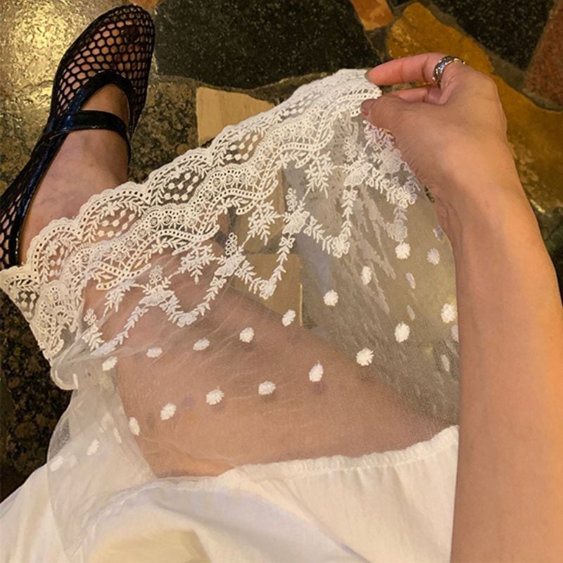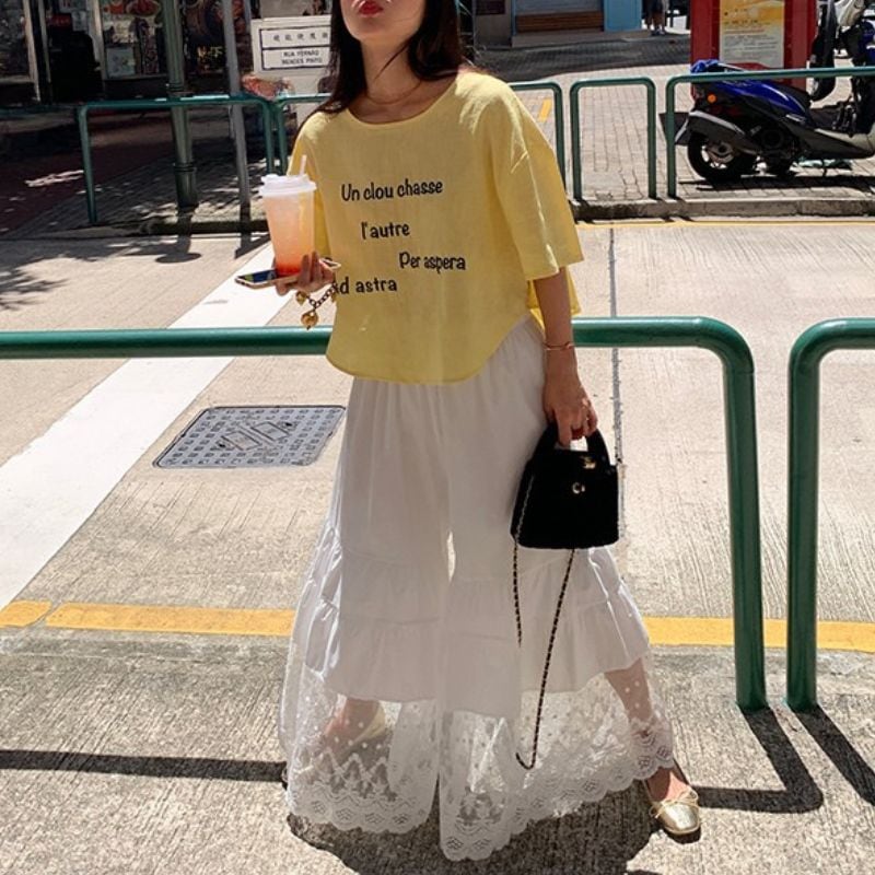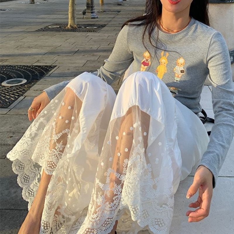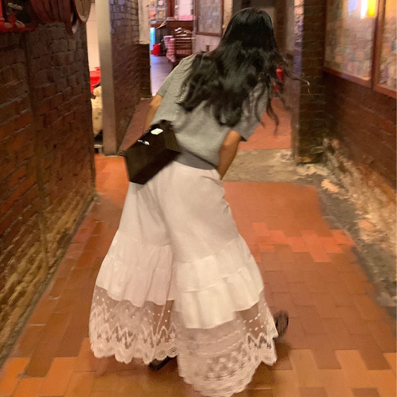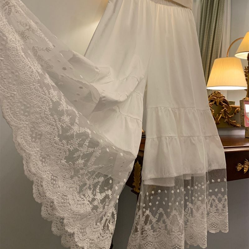 ゆらめくレース裾が印象的なワイドレッグパンツ。