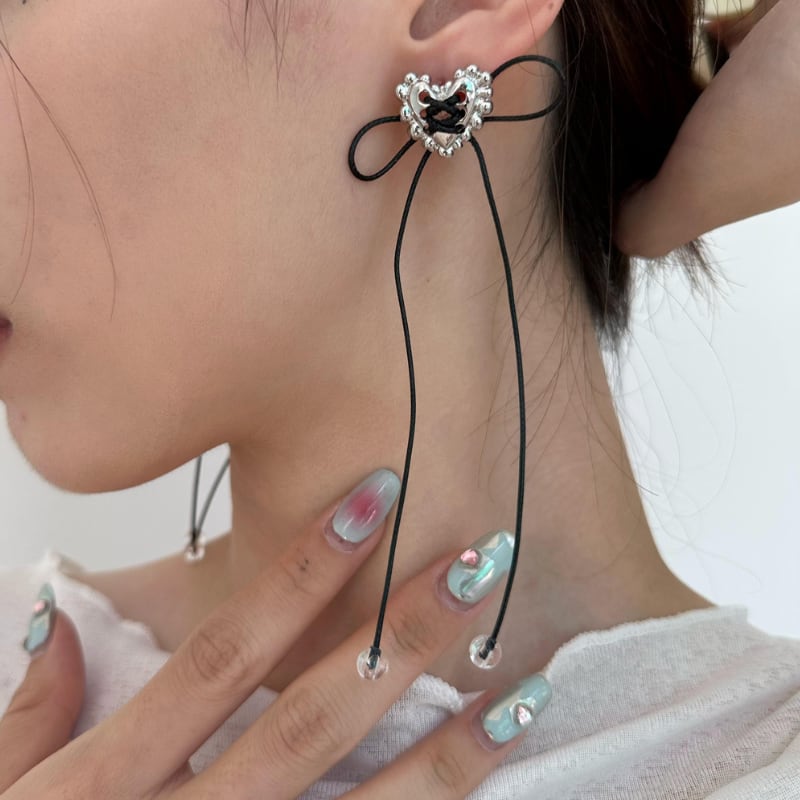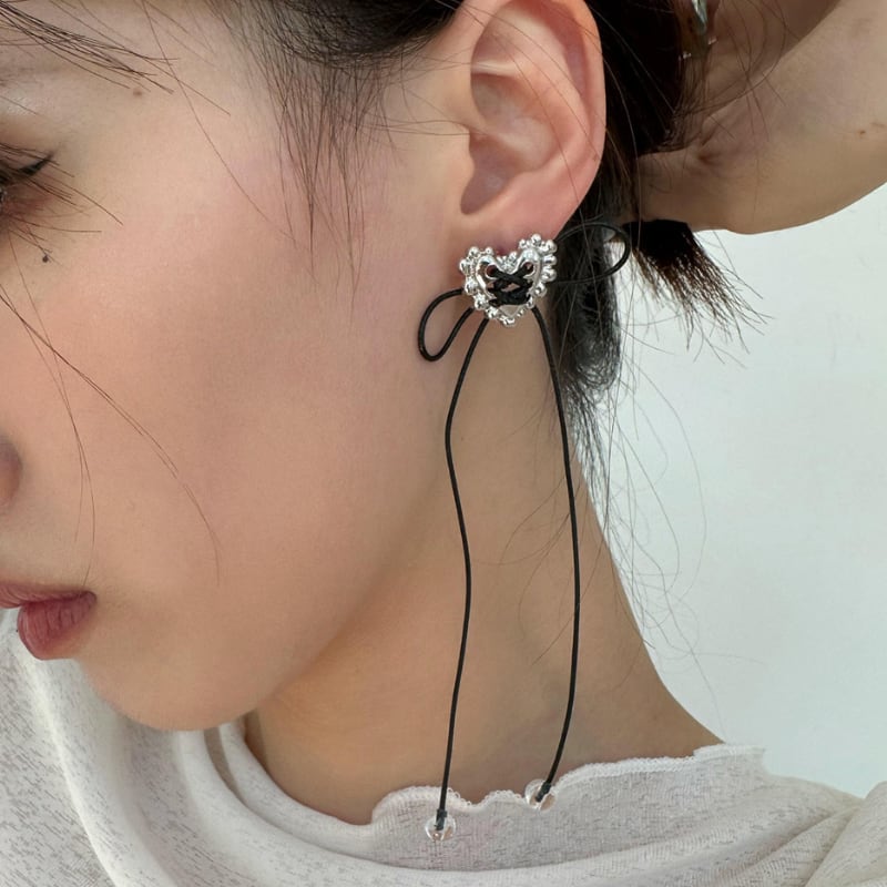 耳元で揺れるリボンがポイントのロングドロップピアス。
