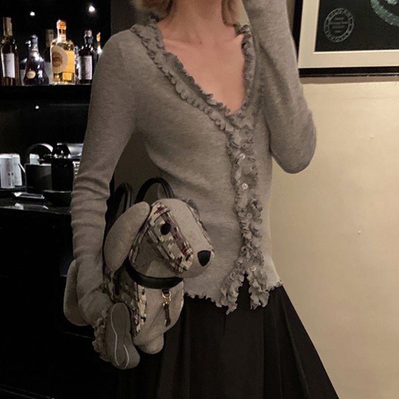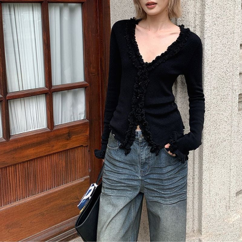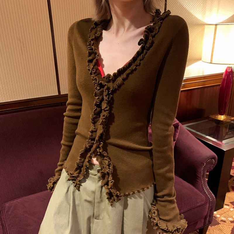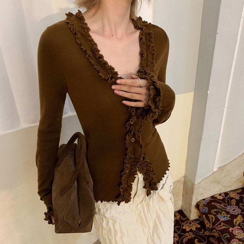 エレガントなレイヤードフリルが華やぎを添えるカーディガン。
