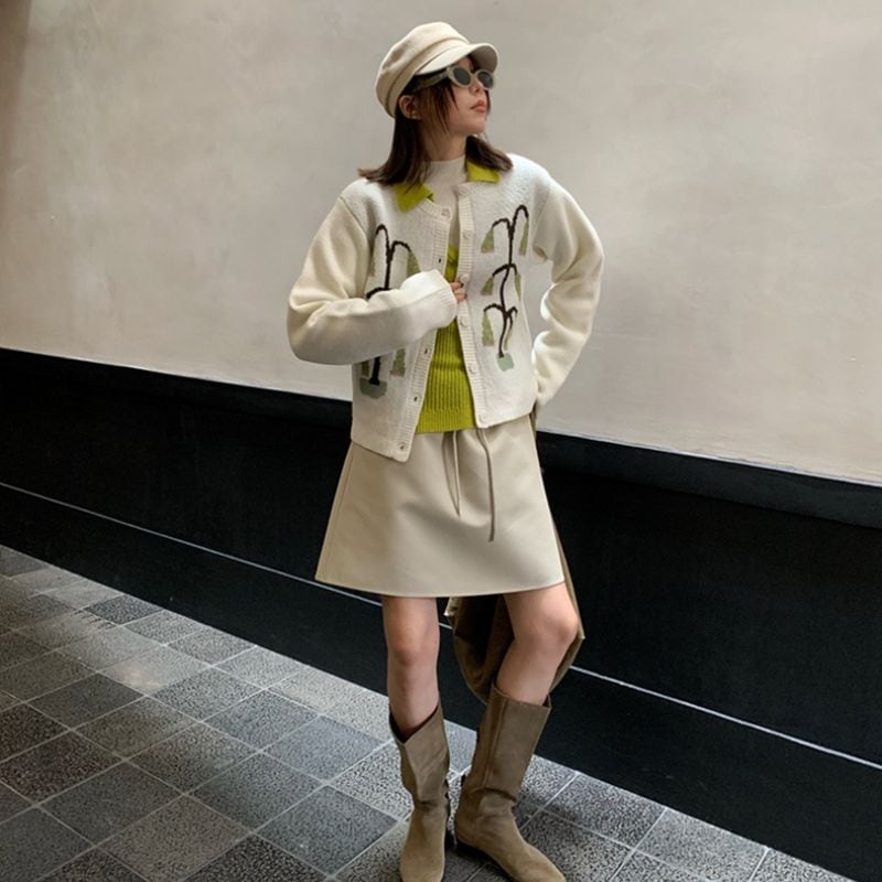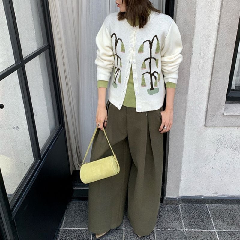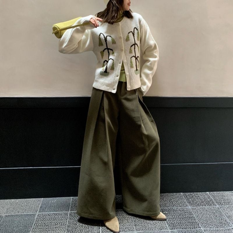立体感のある花柄モチーフが目を惹くニットカーディガン。
