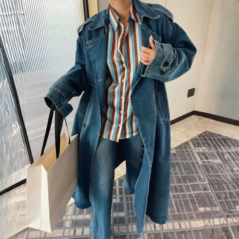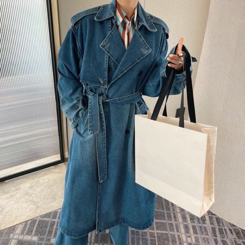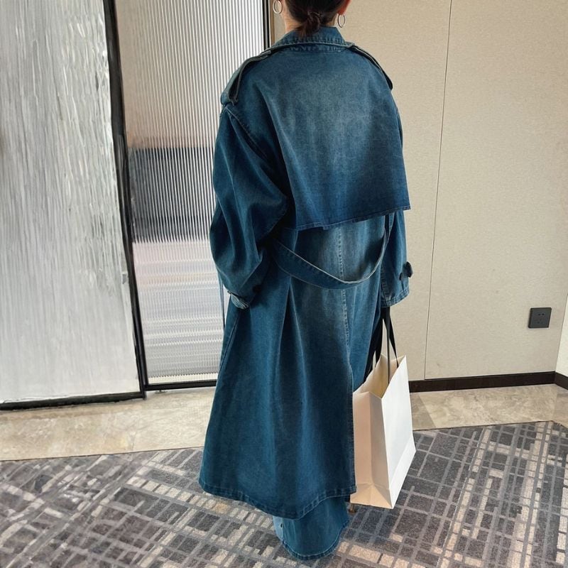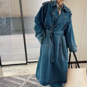 ハンサムな印象を引き立てるデニムロングトレンチコート。