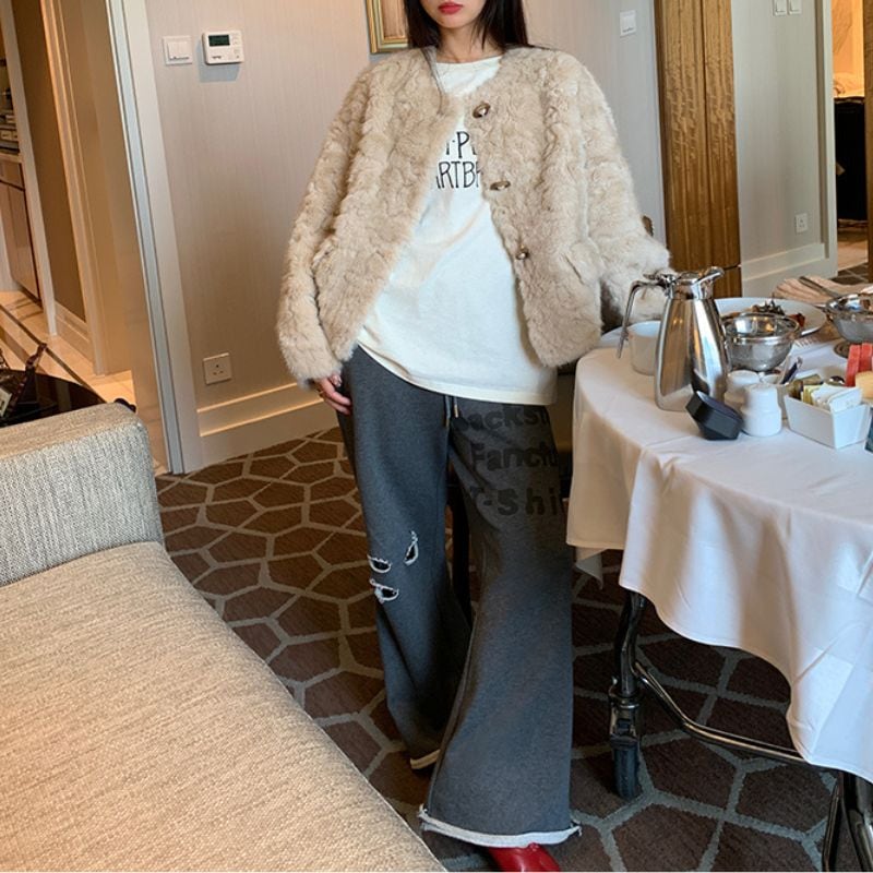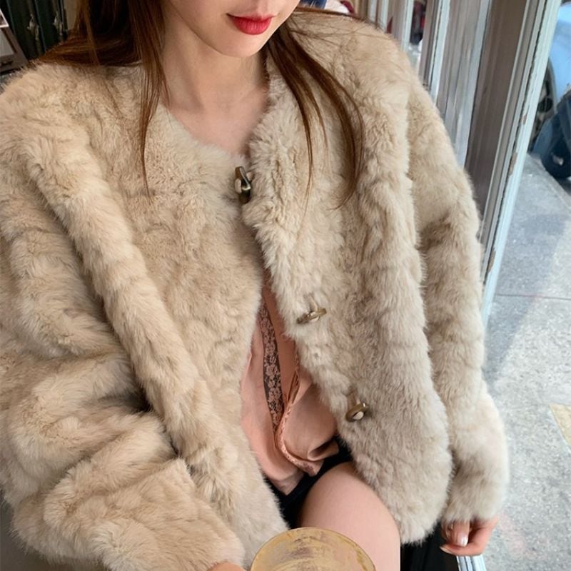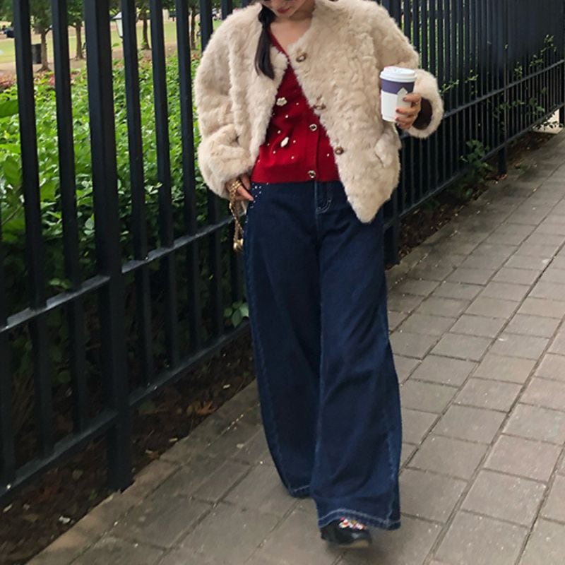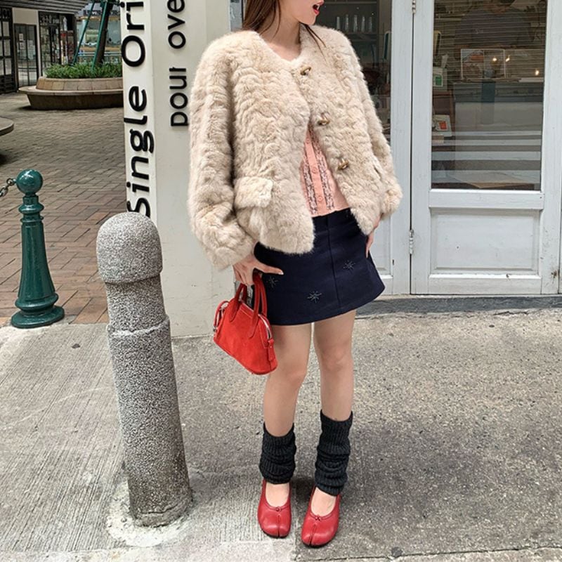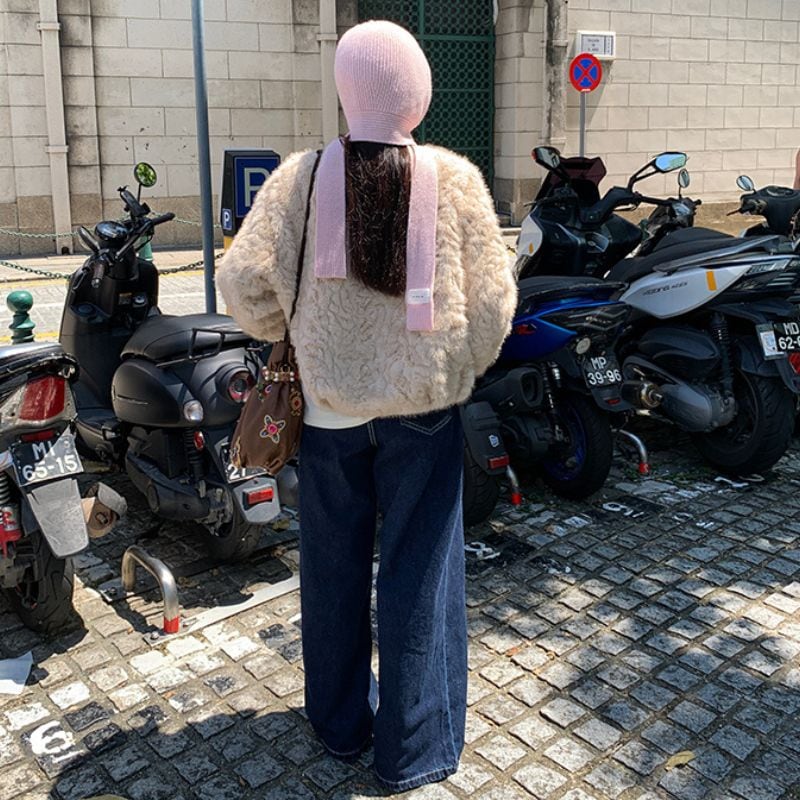 淡いベージュトーンが顔まわりを明るく見せ、冬のスタイリングを優しく彩ります。