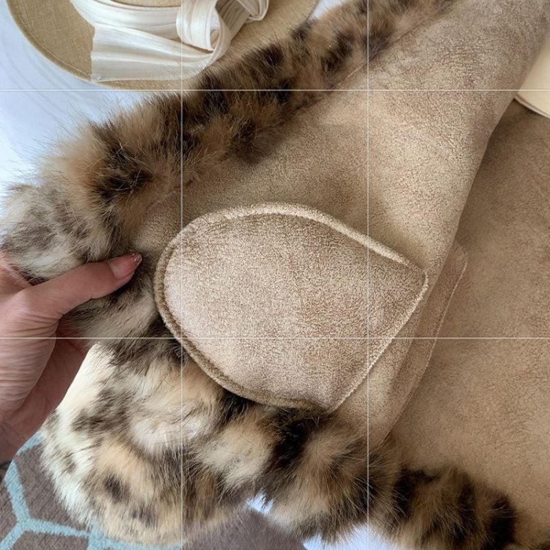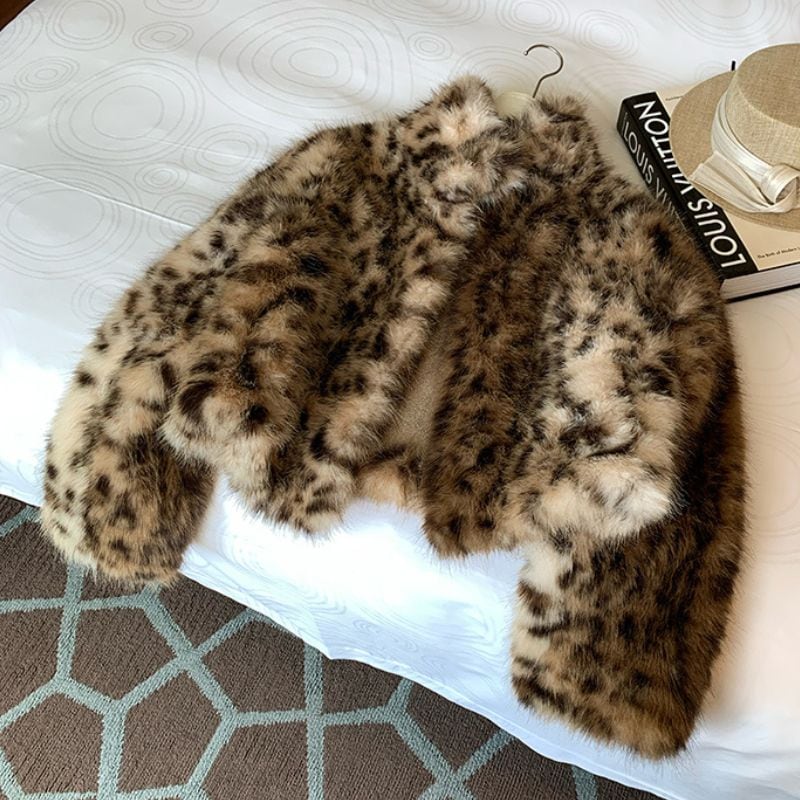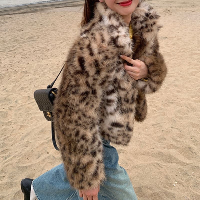 主役級の存在感を放つ、レオパード柄のフェイクファーコート。