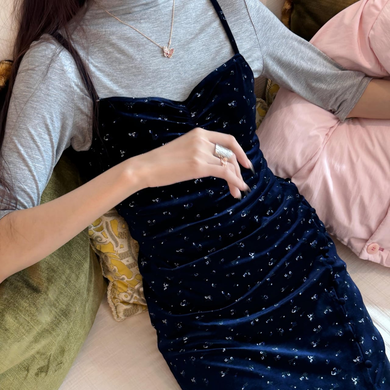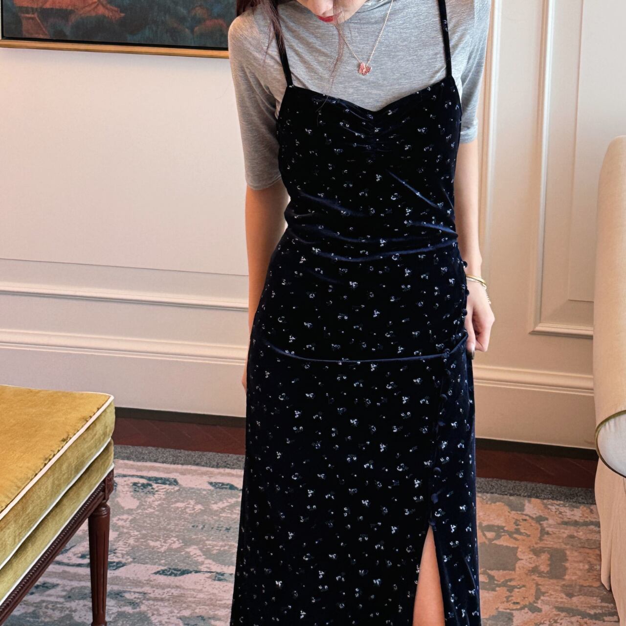 上品な花柄が散りばめられたベルベット素材のキャミソールワンピース。